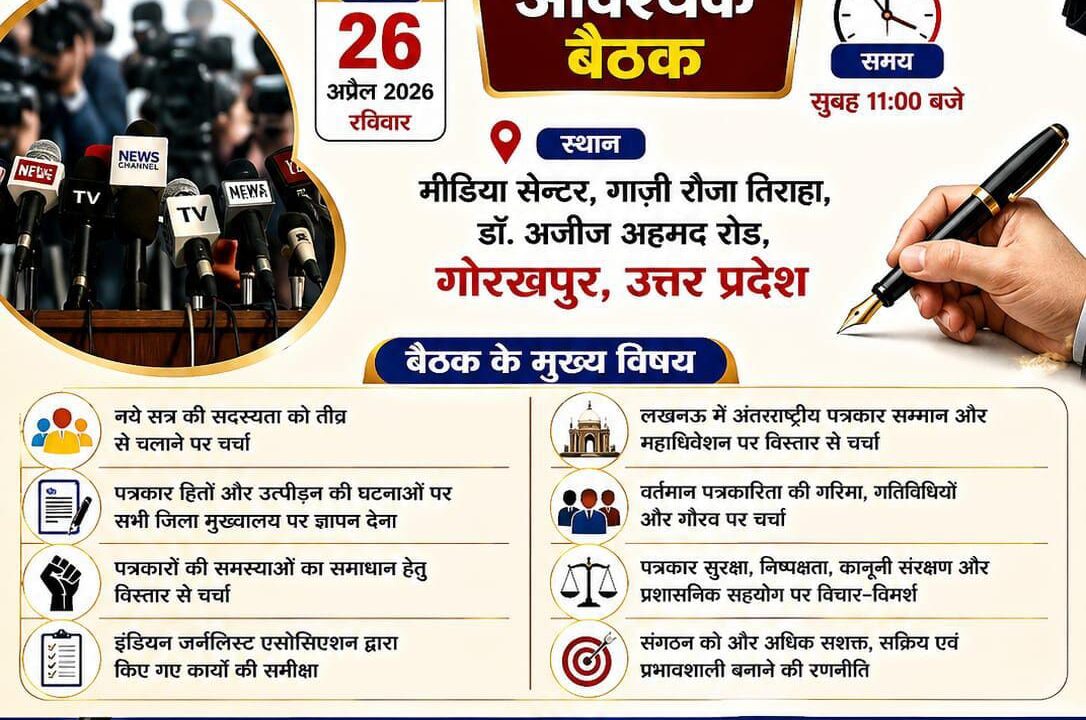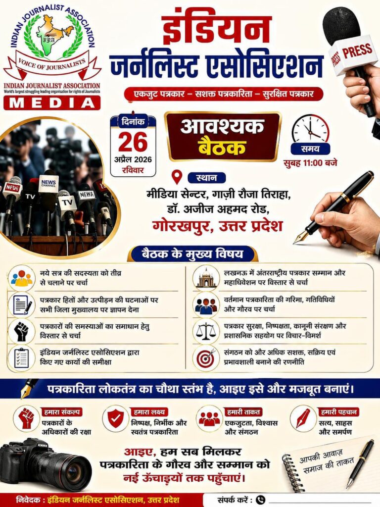 गोरखपुर में 26 अप्रैल को इंडियन जर्नलिस्ट एसोसिएशन की आवश्यक बैठक, पत्रकार सुरक्षा और उत्पीड़न पर होगी चर्चा लखनऊ में...