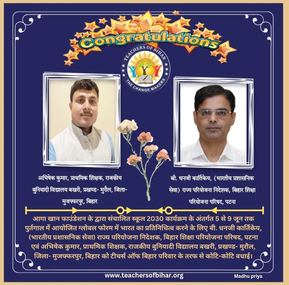 आगा खान फाउंडेशन के द्वारा संचालित स्कूल 2030 कार्यक्रम के अंतर्गत पुर्तगाल के पोर्टो शहर में 5 जून से 9 जून तक आगा खान फाउंडेशन एवं पुर्तगाल सरकार के तत्वाधान में आयोजित 5 दिवसीय ग्लोबल फोरम में बिहार से स्कूल 2030 कार्यक्रम के क्रियान्वयन का एक अभिन्न हिस्सा रहे बी. धनजी कार्तिकेय, (भारतीय प्रशासनिक सेवा) राज्य परियोजना निदेशक, बिहार शिक्षा परियोजना परिषद, पटना एवं अभिषेक कुमार, प्राथमिक शिक्षक, राजकीय बुनियादी विद्यालय बखरी, प्रखण्ड मुरौल, जिला मुजफ्फरपुर जो भारत का प्रतिनिधित्व करेंगे। साथ ही उनके लिए यह एक अच्छा अवसर होगा जहां वे अन्य शिक्षाविदों और नीति निर्माताओं के वैश्विक समुदाय के साथ अपने अनुभव का आदान-प्रदान कर पाएंगे।