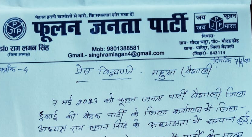 वैशाली !हाजीपुर ! जिले में बढ़ रहे अपराधिक घटनाएं ,हत्याएं एवं दलितों पर अत्याचार के खिलाफ जिला कार्यालय में फूलन जनता पार्टी की एक बैठक सम्पन्न हुई। जिसकी अध्यक्षता पार्टी के जिला अध्यक्ष राम लगन सिंह ने की। बैठक में पार्टी के मुख्य सलाहकार एवं बिहार संगठन प्रभारी राजीव कुमार वर्मा उपस्थित होकर कहा कि जिले के पातेपुर प्रखंड क्षेत्र में दलित महिलाओं पर लाठीचार्ज एवं जेल भेजने की कार्य किया गया है,