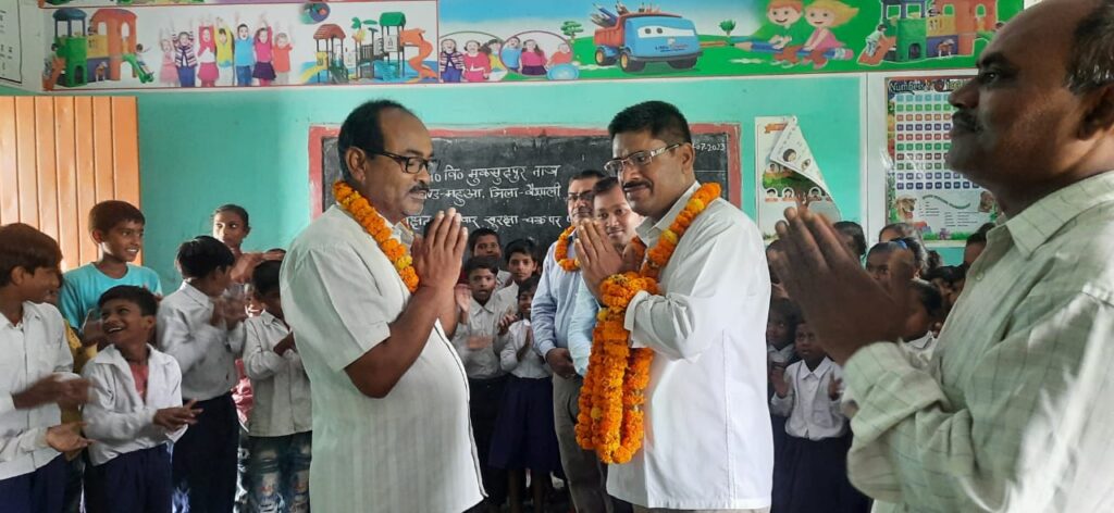 वैशाली:उत्क्रमित मध्य विद्यालय मुकसूदपुर ताज प्रखंड महुआ जिला वैशाली में ग्रीष्मा अवकाश उपरांत विद्यालय आने पर छात्र एवं छात्राओं को पुष्पमाला भेंट कर स्वागत किया गया सभी शिक्षक बारी बारी से इस नौनिहाल देश के भविष्य को आरती पूजा भी किए तत्पश्चात विद्यालय के प्रधान शिक्षक श्री अशर्फी दास जी के द्वारा विद्यालय के सम्मानित सभी शिक्षक गण का माला पहना कर स्वागत किया गया उपस्थित अभिभावकों का भी माला पहनाकर स्वागत किया गया उत्कृष्ट विद्यालय होने पर उप विकास आयुक्त वैशाली एवं जिला शिक्षा पदाधिकारी वैशाली के द्वारा प्रशस्ति पत्र विद्यालय प्रधान अशर्फी दास को दी गई की उस उपलक्ष में विद्यालय के शिक्षक श्री सुनील कुमार, विकास नारायण, ज्योति प्रसाद, संदीप कुमार पूर्व बीएसएस अध्यक्ष राजेश्वर राम, स्वयंसेवक महिंद्र मलिक पूर्व उप मुखिया रामजी पासवान, अजय राम द्वारा सम्मानित किया गया एक स्वर में विद्यालय परिवार की ओर से इस भारत के भविष्य नौनिहाल छात्राओं को गुणवत्तापूर्ण शिक्षा आनंद आनंदायी वातावरण देने की बात कही गई विद्यालय के तमाम छात्र छात्राओं के उज्जवल भविष्य की कामना की गई बैगलेस शनिवार एवं सुरक्षित शनिवार को बच्चों को सर्प दल, वज्रपात, अतिवृष्टि के बारे में शिक्षक श्री ज्योति प्रसाद जी के द्वारा एवं अन्य शिक्षकों के द्वारा सभी वर्ग कक्ष में विस्तारपूर्वक समझाया गया ।