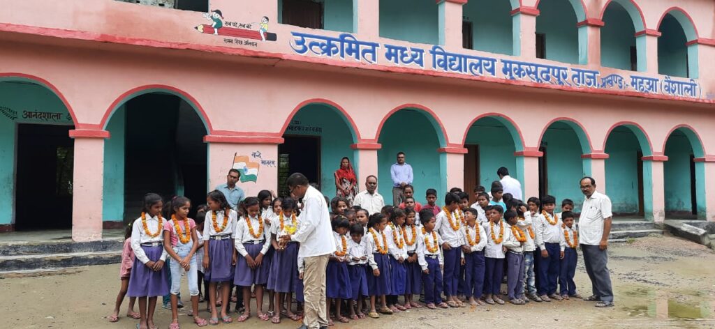 उत्क्रमित मध्य विद्यालय मुकसूदपुर ताज प्रखंड महुआ जिला वैशाली में ग्रीष्मा अवकाश उपरांत विद्यालय आने पर छात्र एवं छात्राओं को पुष्पमाला भेंट कर स्वागत किया गया सभी शिक्षक बारी बारी से इस नौनिहाल देश के भविष्य को आरती पूजा भी किए तत्पश्चात विद्यालय के प्रधान शिक्षक श्री अशर्फी दास जी के द्वारा विद्यालय के सम्मानित सभी शिक्षक गण का माला पहना कर स्वागत किया गया उपस्थित अभिभावकों का भी माला पहनाकर स्वागत किया गया उत्कृष्ट विद्यालय होने पर उप विकास आयुक्त वैशाली एवं जिला शिक्षा पदाधिकारी वैशाली के द्वारा प्रशस्ति पत्र विद्यालय प्रधान अशर्फी दास को दी गई की उस उपलक्ष में विद्यालय के शिक्षक श्री सुनील कुमार, विकास नारायण, ज्योति प्रसाद, संदीप कुमार पूर्व बीएसएस अध्यक्ष राजेश्वर राम, स्वयंसेवक महिंद्र मलिक पूर्व उप मुखिया रामजी पासवान, अजय राम द्वारा सम्मानित किया गया एक स्वर में विद्यालय परिवार की ओर से इस भारत के भविष्य नौनिहाल छात्राओं को गुणवत्तापूर्ण शिक्षा आनंद आनंदायी वातावरण देने की बात कही गई विद्यालय के तमाम छात्र छात्राओं के उज्जवल भविष्य की कामना की गई बैगलेस शनिवार एवं सुरक्षित शनिवार को बच्चों को सर्प दल, वज्रपात, अतिवृष्टि के बारे में शिक्षक श्री ज्योति प्रसाद जी के द्वारा एवं अन्य शिक्षकों के द्वारा सभी वर्ग कक्ष में विस्तारपूर्वक समझाया गया ।