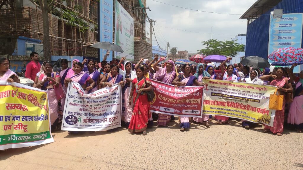 12 जुलाई से हड़ताल पर डटी आशाकर्मियों ने बृहस्पतिवार को अपने राज्यव्यापी अह्वान के तहत सदर अस्पताल से जुलूस निकालकर जिलाधिकारी के समक्ष किया प्रदर्शन। प्रदर्शन के दौरान सड़क जाम हो गई। समाहरणालय जाने के दौरान जाम में श्रम संसाधन विभाग के प्रधान सचिव फंस गये। इसकी जानकारी मिलते ही जिला प्रशासन सक्रिय हो गई। एसडीओ, डीएसपी, नगर एवं मुफस्सिल थानाध्यक्ष, इंसपेक्टर समेत बड़ी संख्या में महिला पुलिस बल मौके पर तैनात कर दिए गये। जिलाधिकारी से वार्ता कराने को मजिस्ट्रेट के नहीं रहने से प्रदर्शनकारी उग्र हो गये। अधिकारियों के जाम हटाने के आग्रह को उग्र आंदोलनकारी मानने से इनकार कर दिया। इस दौरान बड़ी संख्या में पहुंची आशाकर्मियों ने जोरदार नारेबाजी करते हुए समाहरणालय के मुख्य द्वार पर धरना पर बैठ गये। इससे समाहरणालय पर हंगामा की स्थिति उत्पन्न हो गई। अंत में वरीय अधिकारियों के आदेश पर पुलिस द्वारा आशाकर्मियों से जाम हटाने अन्यथा बल प्रयोग करने का ऐलान माईक से कराया गया। इसी बीच बिहार राज्य आशा कार्यकर्ता संघ के जिला जिलामंत्री तरन्नुम फैजी एवं योगेंद्र गुट के आशासंघ की मंत्री सुनीता प्रसाद के नेतृत्व में जिलाधिकारी योगेन्द्र सिंह से वार्ता करने गई 7 सदस्यीय डेलीगेट को अंदर में एक घंटा से डिटेन करने का अफवाह फैल गया। बगैर अपने नेता को बाहर निकले आंदोलनकारियों ने रोड खाली करने से इनकार कर दिया। इसकी जानकारी प्रशासन को मिलते ही जिलाधिकारी के आदेश पर तत्काल समाहरणालय कक्ष में सदर अनुमंडलाधिकारी द्वारा सकारात्मक वार्ता करने के बाद प्रतिनिधिमंडल ने बाहर निकलकर गेट पर संक्षिप्त सभा कर वार्ता की जानकारी दी और तत्काल आज का प्रदर्शन समाप्त करने की घोषणा की। सभा की अध्यक्षता तरन्नुम फैजी ने की जबकि सभा को वीणा कुमारी, शोभा झा, रंजू कुमारी, कल्पना कुमारी, अर्चना झा, रेखा कुमारी, गीता कुमारी, अंजु कुमारी, पुनम कुमारी, सुनीता देवी, सुमित्रा देवी, उषा कुमारी, रंजन कुमारी समेत अन्य आशा नेताओं ने संबोधित किया।