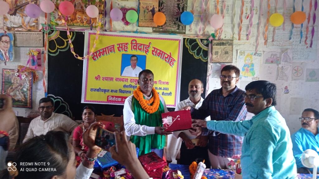 रविवार को राष्ट्रपति पुरस्कार से सम्मानित इस्लामपुर मध्य विद्यालय से सेवा निवृत शिक्षक श्याम नंदन ठाकुर को विद्यालय परिवार ओर से विदाई समारोह का आयोजित किया गया. इस अवसर पर उपस्थित वक्ताओं ने कहा कि श्री ठाकुर को सम्मान जब राष्ट्रपति प्रतिभा पाटिल द्वारा किया गया इससे बड़ा सम्मान और क्या हो सकता है . वर्ष 1994 में इसी विद्यालय में श्री ठाकुर की बहाली हुई और पिछले 30 जून को इसी विद्यालय से अवकाश प्राप्त किया. 29 वर्षों तक इस विद्यालय की सेवा की और अपनी सेवा और मीना मंच के के द्वारा विद्यालय को एक नई पहचान दिलाने का काम किया . वर्ष 2007 से 8 के बीच मीना मंच के संयोजक शिक्षक के रूप में उन्होंने उत्तम कार्य किया जिसके कारण वर्ष 2009 में इन्हें राष्ट्रपति पुरस्कार से सम्मानित किया गया और इसी विद्यालय के मीना मंच की छात्रा के आमंत्रण पर बिहार के मुख्यमंत्री नीतीश कुमार इस विद्यालय में आए और इसे उच्च विद्यालय घोषित किया था . वर्ष 2005 में इन्होंने 40 शिक्षामित्रों को प्रशिक्षित किया जो आज के समय में इनके द्वारा प्रशिक्षित शिक्षक डॉ अरविंद शरण,प्रणव कुमार ,धर्मेंद्र कुमार, देवाशीष कुमार दिलीप कुमार रीता कुमारी उपस्थित थे. कार्यक्रम का की अध्यक्षता विद्यालय के प्रधानाध्यापक देवेंद्र कुमार द्वारा किया गया जबकि संचालन कौशर परवेज खान द्वारा किया गया. कार्यक्रम में प्रधानाध्यापक सुदर्शन झा, अरविंद आर्य,विपिन कुमार पांडेय, परवेज आलम सहित अन्य लोग उपस्थित थे.