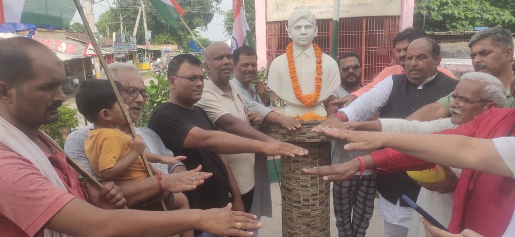 “मेरा माटी मेरा देश” कार्यक्रम के तहत शनिवार को नगर मण्डल सोनपुर में अमर शहीद महेश्वर बाबु के प्रतिमा पर राष्ट्रहित मे सभी को पंचनिष्ठा का शपथ दिलाया गया एवं अमर शहीदों एवं स्वतंत्रता सेनानी के परिवार से मिलकर ससम्मान उनके घर का मिट्टी कलश मे एकत्रित किया गया ।इस कार्यक्रम मे प्रदेश कार्यसमिति सदस्य उपेन्द्र सिंह कार्यक्रम प्रभारी नरेश सिंह नगर मण्डल अध्यक्ष शशिभूषण सिंह, निवर्तमान अध्यक्ष मुकेश कुमार सिंह बब्लु, धनंजय सिंह, संजीव कुमार सिंह, सत्येन्द्र सिंह, ज्ञानेंद्र कुमार सिंह टुनटुन,नगर उपाध्यक्ष ज्ञानसागर सिंह एवं मुकेश कुमार सिंह,समाजसेवी लालबाबु पटेल दोव्यांशु गौतम, महामंत्री नकुल कुमार सिंह, निर्मल सिंह, नरेश राय इत्यादि शामिल हुए।