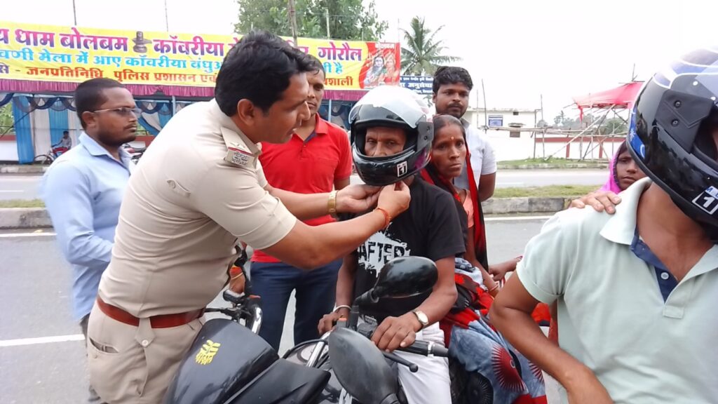 बिना हेलमेट पहने बाइक सवार को गोरौल पुलिस ने निशुल्क पहनाया हेलमेट।