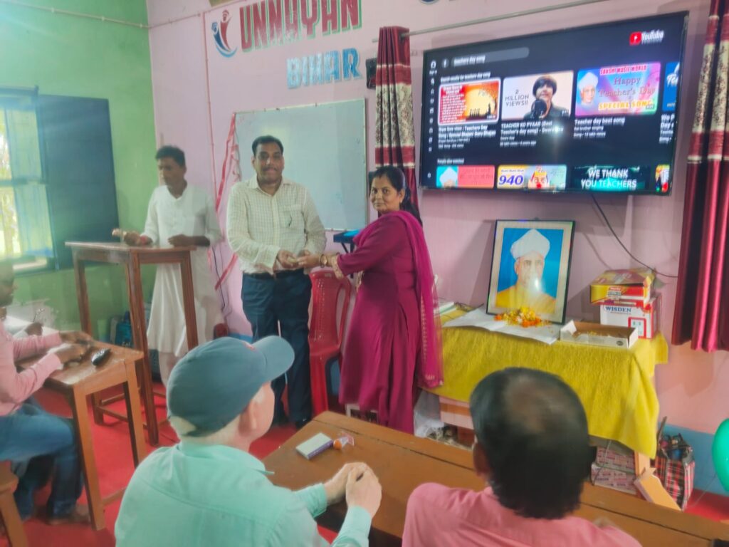 मुजफ्फरपुर। जिला सकरा प्रखंड अंतर्गत चंदनपट्टी पंचायत में अवस्थित गिरींद्र नारायण उच्चतर माध्यमिक विद्यालय में आजाद भारत के पहले उपराष्ट्रपति तथा दूसरे राष्ट्रपति डॉ सर्वपल्ली राधाकृष्णन जी के जन्म दिवस पर स्मार्ट क्लास में शिक्षक दिवस धूमधाम से मनाया गया। और प्रधानाध्यापिका श्रीमती रेणु आंनद की अध्यक्षता और विज्ञान के शिक्षक श्री लालबाबू प्रसाद की बेहतरीन संचालन में एक कार्यक्रम आयोजित किया गया जिसमें मुख्य अतिथि के रुप में पहुँचे पंचायत समिति सदस्य वह भुमि दाता के वंशज श्री रंजीत कुमार सिन्हा जिन्हें विधालय परिवार की ओर से कलम देकर सम्मानित किया गया कार्यक्रम से सम्बोधित करते हुए रंजीत कुमार सिन्हा ने कहा कि शिक्षक समाज में उच्च आदर्श स्थापित करने वाला व्यक्तित्व होता है।