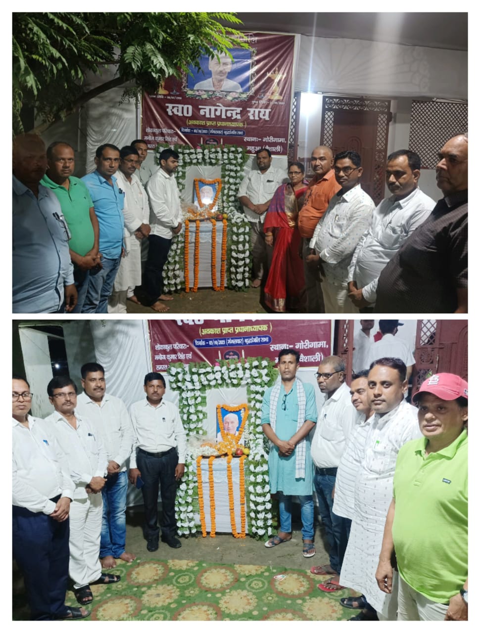 महुआ प्रखंड क्षेत्र के बिशनपुर हीराराम उर्फ पहाड़पुर पंचायत के गोरिगामा निवासी सेवानिवृत प्रधानाध्यापक स्वर्गीय नागेंद्र राय की श्राद्ध कार्यक्रम के मौके पर श्रद्धांजलि सभा का आयोजन किया गया । इस श्रद्धांजलि सभा में उपस्थित महुआ प्रखंड क्षेत्र के शिक्षक शिक्षिकाओं,राजनीति क्षेत्र से जुड़े लोगों के साथ साथ विभिन्न क्षेत्र से जुड़े लोगों ने स्वर्गीय नागेंद्र राय के तैल चित्र पर पुष्पांजलि अर्पित कर अपनी श्रद्धा सुमन अर्पित की। इस मौके पर बड़े पुत्र शाहपुर चकुमर के प्राचार्य मनोज कुमार सिंह, प्रखंड शिक्षा पदाधिकारी महोदया महुआ श्रीमती अर्चना कुमारी, पंचायत के मुखिया संजीत कुमार, पूर्व उप प्रमुख सत्येंद्र राय, रामप्रवेश राय, डॉक्टर के सी विद्यार्थी, उपेन्द्र राय,पैक्स अध्यक्ष उत्कर्ष कुमार उर्फ बच्चा बाबू, अरुण कुमार , राघवेंद्र प्रसाद,अशर्फी दास, सिकंदर कुमार, अनिल कुमार सुमन, अमित कुमार, सत्येंद्र कुमार, सुधीर कुमार ,मोहम्मद दिलशेर, मोहम्मद सुल्तान, मोहम्मद सलाउद्दीन ,केदार प्रसाद यादव, डॉ रामनरेश राय, रवि कुमार, मुन्ना रजक आदि के साथ साथ राजापाकर से आए हुए अनेकों शिक्षकों ने श्रद्धांजलि अर्पित की ।