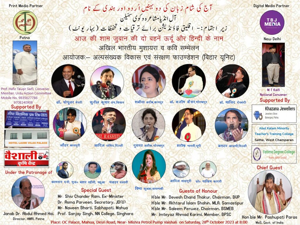 वैशाली राजा विशाल ,भगवान महावीर , भगवान बुद्ध ,अमरपाली , सैयद शाह जलालुद्दीन, मामा भांजा जैसे सूफी संतों की धरती महुआ वैशाली में एक शाम दो बहनों की भाषा उर्दू हिंदी के नाम आगामी 28 अक्टूबर 2023 को ऑल इंडिया कवि सम्मेलन एवं मुशायरा का आयोजन किया जा रहा है जिसमें भारत देश के प्रसिद्ध कवयित्री एवं कवि एवं हास्य कवि पधारेंगे और इस देश की गंगा जमुनी शिष्टाचार एवं आपसी भाईचारे का संदेश अपने पंक्ति के द्वारा देंगे जिन में महान कवि डाक्टर मजीद देवबंदी यूपी , डॉक्टर कलीम कैसर गोरखपुर , शबीना अदीब कानपुर, जौहर कानपुरी , डॉक्टर पॉपुलर मेरठी मेरठ , अख्तर आजमी नई दिल्ली , शरीफ भारती यूपी , नुसरत अतीक गोरखपुर , आदिल रशीद नई दिल्ली , सुनील कुमार तंग सिवान , प्रोफेसर नाजिम क़ादरी सिंघाड़ा वैशाली , कामरान गनी सबा मुजफ्फरपुर , बशर रहीमी वैशाली , मजहर वस्तवी वैशाली , आदिल शाहपुरी वैशाली अपने मधुर स्वर से दर्शकों का दिल जीतने का काम करेंगे ज्ञात हो कि यह मुशायरा अल्पसंख्यक फाउंडेशन बिहार यूनिट के तत्वाधान आयोजन किया जा रहा है जिसके राष्ट्रीय कन्वेनर मोहम्मद तशकील कैफ़ी एवं जॉइंट कन्वेनर बिहार यूनिट के प्रोफेसर हाफिज तौकीर सैफी पूर्व महुआ नगर पार्षद सदस्य एवं उर्दू एक्शन कमिटी बिहार जिला वैशाली महासचिव मुख्य भूमिका का निभाएंगे साथ ही महुआ निवासी के एक-एक जनता इस कार्यक्रम को सफल बनाने के लिए तत्पर रहेंगे साथ ही इस भव्य मुशायरा के सहयोगी में मीसा क्लिनिक हाजीपुर , जीवक हॉस्पिटल एंड रिसर्च इंस्टीट्यूट पटना , वैशाली कृषि केंद्र हाजीपुर , खजाना ज्वेलर्स पटना , अब्दुल कलाम अल्पसंख्यक टीचर ट्रेनिंग कॉलेज चंपारण फातमा डिग्री कॉलेज पटना भी अहम भूमिका निभाएंगे तथा मुख्य अतिथि के रूप में एशिया महादेश के प्रसिद्ध डॉक्टर अब्दुल अहमद हयी डायरेक्ट एच एम आर ए पटना , मोहम्मद सलीम परवेज अंसारी बिहार स्टेट मदरसा एजुकेशन बोर्ड पटना , इम्तियाज अहमद करीमी बिहार लोक सेवा आयोग पटना , डॉक्टर आसमा परवीन जदयू प्रदेश महासचिव महिला संघ , नवीन कुमार भारती सभापति नगर पार्षद महुआ वैशाली , प्रोफेसर संजय कुमार सिंह सिंघाड़ा कालेज वैशाली समेत कई और गणयमान्य व्यक्ति उपस्थित रहेंगे साथ ही इस प्रोग्राम में लोजप्पा के केंद्रीय मंत्री श्री पशुपति कुमार पारस जी उपस्थित होकर कवि एवं कवित्री को धन्यवाद ज्ञापन करेंगे तथा इस कवि सम्मेलन एवं मुशायरा का रिपोर्ट पत्रकार द्वारा दैनिक उर्दू क़ौमी तंजीम पटना , टी बी जे इलेक्ट्रॉनिक मीडिया नई दिल्ली, दैनिक उर्दू तासीर पटना, दैनिक उर्दू फारुकी तंजीम पटना, दैनिक उर्दू एक कौम पटना, दैनिक उर्दू सहारा , दैनिक प्यारी उर्दू पटना , दैनिक उर्दू बिहार की आवाज पटना , दैनिक उर्दू पिंदार पटना , दैनिक उर्