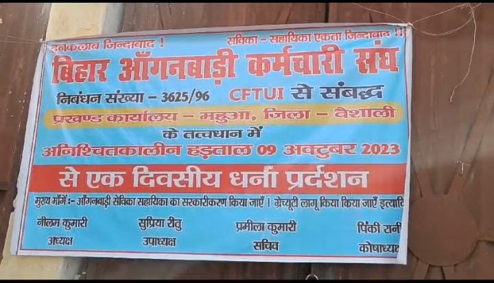वैशाली! महुआ, बाल विकास परियोजना कार्यालय परिसर में बिहार राज्य आंगनबाड़ी कर्मचारी संघ के आह्वान पर अनिश्चितकालीन धरना पर बैठी है सेविका, सहायिका ।अपने पास पांच सूत्री मांगों में सरकारी कर्मचारी का दर्जा देने ,वेतन 25 000 रुपए करने,मृत्यु उपरांत आश्रितों को नौकरी देने जैसी मांगों को लेकर धरना प्रदर्शन कर रही है।राज्य सरकार से वादा खिलाफी का दोष देते हुए नीतीश, तेजस्वी हाय हाय के नारे लगाते नजर आ रहे हैं। केंद्रीय मंत्री स्मृति ईरानी के खिलाफ में भी नारे लग रहे हैं। धरना का नेतृत्व सेविका संघ के अध्यक्ष नीलम कुमारी ,उपाध्यक्ष सुप्रिया रितु ,कोषाध्यक्ष पिंकी रानी ,सविता कुमारी, सावित्री कुमारी, धर्मशिला सहित सभी सेविका,सहायिका धरना स्थल पर डटी हुई है ।इनका कहना जब तक राज्य सरकार हमारी मांगे पूरी नहीं करेगी ,तब तक यह धारणा चलता रहेगा।