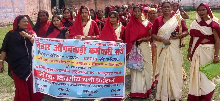 सेविका सनके प्रखंड अध्यक्ष नीलम कुमारी, उपाध्यक्ष सुप्रिया रितु, सचिव प्रमिला कुमारी के नेतृत्व में पिंकी रानी, सावित्री कुमारी, कुमारी धर्मशिला, रूपम कुमारी, मंजू, सरिता, रंजू, उषा, निभा, आशा, सीमा आदिनी धरना प्रदर्शन कर अपनी मांगों को रखा।उनका अनिश्चित हड़ताल चल रहा है।