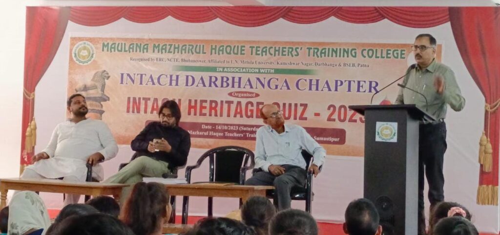 आज दिनांक 14.10.2023 को समस्तीपुर के मौलाना मज़हरूक हक टीचर्स ट्रेनिंग कॉलेज, मथुरापुर, समस्तीपुर में इंडियन नेशनल ट्रस्ट फॉर आर्ट एंड कल्चरल नेशनल हेरिटेज , दरभंगा चैप्टर द्वारा नेशनल हेरिटेज क्विज 2023 का आयोजन किया गया था। इस कार्यक्रम का उद्घधाटन इंटेक दरभंगा चैप्टर के संयोजक प्रो० एन० के० अग्रवाल ने किया। इस अवसर पर उन्होंने बताया कि भारत में विरासत जागरूकता और संरक्षण को बढ़ावा देने के लिए 27 जनवरी, 1984 को इंटेक की स्थापना की गई थी।आज इंटेक दुनिया के सबसे बड़े विरासत संगठनों में एक माना जाता है, देशभर में इसके 200 से अधिक चैप्टर है। इसके द्वारा प्राकृतिक और निर्मित विरासत के संरक्षण का काम किया जा रहा है। इंटेक का मुख्यालय नई दिल्ली में है। यह वास्तुकला विरासत, प्राकृतिक विरासत,कला और भौतिक विरासत,अमूर्त सांस्कृतिक विरासत,विरासत शिक्षा और संचार सेवा, शिल्प और सामुदायिक सेल, अध्याय, इंटेक विरासत अकादमी, विरासत पर्यटन जैसे विभिन्न प्रभागो के माध्यम से संचालित होता है। इंटेक की डॉक्यूमएंट्री फिल्म “दी ब्लैक पाटरी ऑफ निजामाबाद” ने हेरिटेज फिल्म में “निर्देशक विशेष पुरस्कार” जीता। इंटेक ने राष्ट्रपति भवन में रखी कला वस्तुओ के संरक्षण का काम किया है।