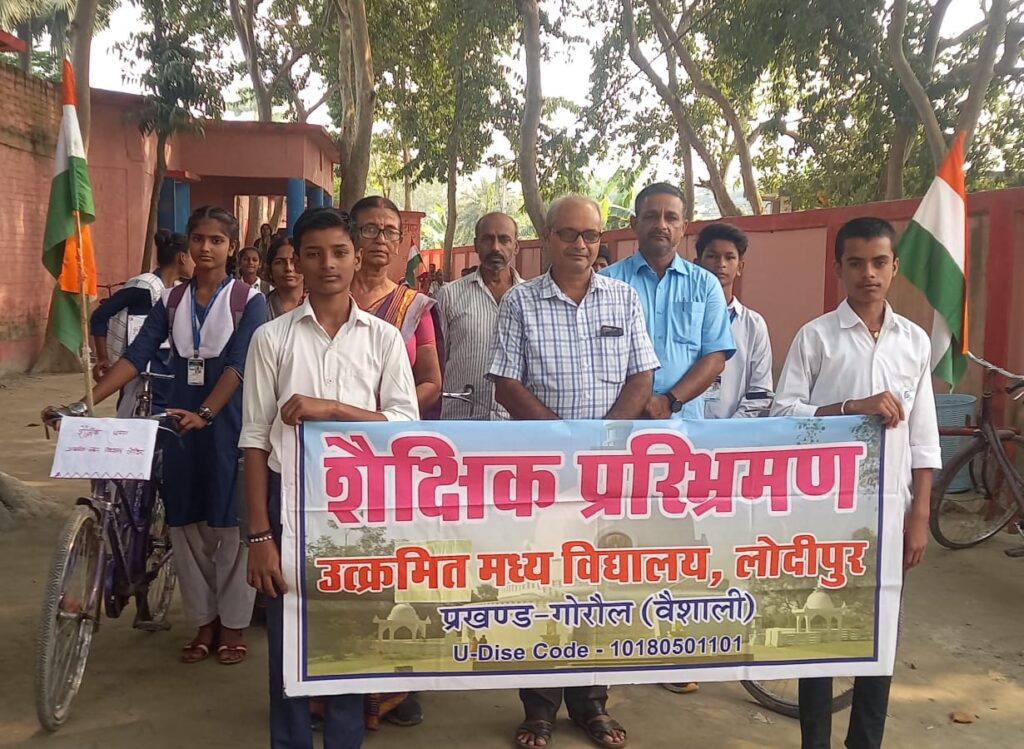 प्रधानाध्यापक विनोद कुमार के द्वारा बच्चों के जत्था को हरी झंडी दिखाकर विद्यालय से रवाना किया गया है । दर्जनों बच्चों का समूह साइकिल पर तिरंगा झंडा लगाकर साइकिल की घंटी बजाते हुए बिहार के प्रथम स्पीकर बिंदेश्वरी प्रसाद वर्मा के गांव की ओर प्रस्थान करते हैं ।