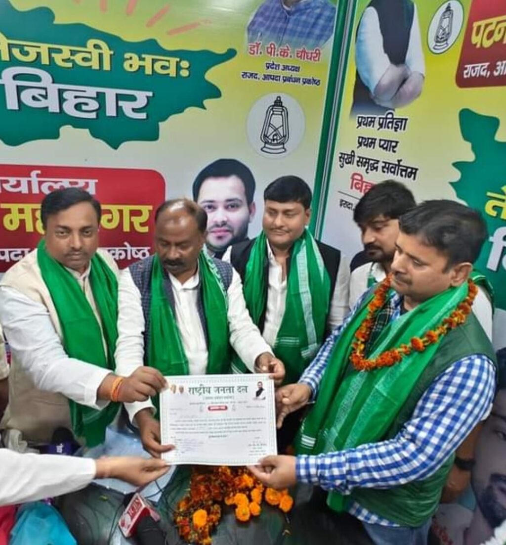 राजद के राष्ट्रीय अध्यक्ष श्री लालू प्रसाद एवं बिहार के उप मुख्यमंत्री तेजस्वी प्रसाद यादव के निर्देश तथा राजद प्रदेश अध्यक्ष श्री जगदानंद सिंह के परामर्श से गोरौल प्रखंड क्षेत्र के नारायणपुर बेदौलिया गोरौल बाजार के निवासी दीपक कुमार सिंह को राष्ट्रीय जनता दल आपदा प्रबंधन प्रकोष्ठ का प्रदेश सचिव बनाया गया है , ये मनोनयन पत्र देते हुए पुर्व कला एवं संस्कृति मंत्री श्री शिवचंद्र राम एवं आपदा प्रबंधन प्रकोष्ठ के प्रदेश अध्यक्ष डॉ पी के चौधरी ने कहा कि समाजिक कार्यकर्ता दीपक कुमार को सचिव पद पर आसीन होने से पार्टी में मजबूती आई है,