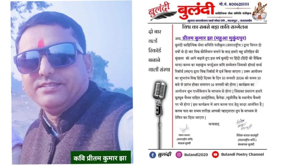 विश्व हिंदी दिवस के उपलक्ष्य में हिंदी की वैश्विक यात्रा बुलंदी पर हिंदी नामक इस कवि सम्मेलन को हॉवर्ड वर्ल्ड रिकॉर्ड लंदन द्वारा विश्व रिकॉर्ड में दर्ज किया जाएगा। उक्त आयोजन में महुआ वैशाली के चर्चित युवा कवि सह गीतकार प्रीतम कुमार झा को भी काव्य पाठ हेतु निमंत्रण संस्था के संस्थापक अंतरराष्ट्रीय कवि बादल बाजपुरी एवं संरक्षक अंतरराष्ट्रीय कवि पंकज प्रकाश द्वारा दिया गया है l बुलंदी संस्था ने वर्ष 2021 और 2022 में 207 घंटे और 400 घंटे अनवरत वर्चुअल कवि सम्मेलन आयोजित करवाकर दो बार विश्व वर्ल्ड रिकॉर्ड बना चुकी है जिससे इंडिया वर्ल्ड रिकॉर्ड में भी दर्ज किया गया , बुलंदी संस्था उत्तराखंड के बाजपुर से संचालित होती हैं, जिसका उद्देश्य नवोदित कलाकारों को मंच प्रदान करना है और इसके लिए संस्था निःस्वार्थ भाव से कार्य कर रही हैं। बहुत ही कम समय में बड़े -बड़े आयोजन आयोजित करवा कर बुलंदी संस्था ने अपने नाम को सार्थक कर दिया है। संस्था का यह तीसरा वर्ल्ड रिकॉर्ड साहित्य जगत की सुर्खियों में बना हुआ है। ज्ञात हो कि इससे पहले भी प्रीतम कुमार झा ने दस से अधिक विश्व रिकार्ड कार्यक्रमों में हिस्सा लेकर महुआ का नाम रौशन किया है। तीन हजार से अधिक राष्ट्रीय अंतरराष्ट्रीय और प्रादेशिक सम्मान और पुरस्कार उन्हें मिल चुका है। आने वाले समय में अब वे दक्षिण अफ्रीका तंजानिया भी कार्यक्रम में शामिल होने जा रहे हैं। इस ख़बर को लेकर लोगों में काफी उत्साह है और लगातार उन्हें देश, विदेश से बधाईयां मिल रही है।