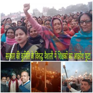 حاجی پور/ شبانہ فردوس/ بہار سرکار کے سابقہ اور حالیہ سرکار کے نئے نئے فرمان نئے نئے قانُون اساتذہ کرام کے لیے جان لیوا بنتا جا رہا ہے اس ہٹلری فرمان سے تنگ آکر مرد وخواتین اساتذہ کرام نے 10 فروری 2024 کو ضلع سطحی طور پر صبح بہار کے 38 ضلع میں اساتذہ کرام نے شام کے چھ بجے سے ضلع کے مرکزی میں مشال جلوس نکال کر سرکار کے خلاف اور محکمہ تعلیم کے چفٹ سیکرٹری کے، کے، پاٹھک کے خلاف زبردست احتجاج جتایا جلوس کا آغاز ضلع ویشالی مجسٹریٹ کہ شاہراہ سے لے کر حاجی پور کے گاندھی چوک جواہر چوک کچہری روڈ انور پر چوک ہوتے ہوئے سکوت کے ساتھ احتجاج جتایا اور نتیش کمار ہائے ہائے کے کے پاٹک ہائے ہائے کا بھی نعرہ گونجتا رہا ساتھ ہی یہ بھی نعرہ گونجتا رہا یہ تو ایک انگرائی ہے آگے ایک لڑائی ہے اس جلوس میں ضلع ویشالی کے 16 بلاکوں کے اساتذہ کرام حاضر ہو کر احتجاج کیا جس میں خاص طور پر تمام اساتذہ تنظیم کے صدور و سیکریٹری و خازن و منتظمین و ذیلی رکن شرکت کی ساتھ ہی ہزاروں کی تعداد میں مرد وخواتین اساتذہ کرام نے شرکت کر احتجاج کو کامیاب بناۓ