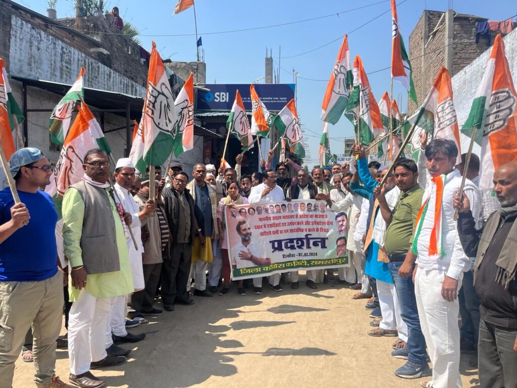 अखिल भारतीय कांग्रेस कमिटी के आह्वान पर तथा बिहार प्रदेश कांग्रेस कमिटी के निर्देशानुसार जिला कांग्रेस कमेटी समस्तीपुर के तत्वधान में माननीय उच्चतम न्यायालय के आदेश का भाजपा के दबाव में एसबीआई द्वारा उलंघन करने और इलेक्टोरल बॉन्ड खरीदने वालों का नाम सार्वजनिक न करने के विरुद्ध स्टेट बैंक ऑफ इंडिया की स्थानीय शाखा के समक्ष रोष पूर्ण प्रदर्शन किया गया। जिसमें बड़ी संख्या में कांग्रेसजनों ने भाग लिया। इससे पूर्व कांग्रेसजन एक जुलूस के रूप में मथुरापुर स्थित जिला कार्यालय से निकल कर विभिन्न मार्गो से होते हुए बैंक तक पहुंचे। वे अपने हाथों में विभिन्न मांगों की तख्तियां लिए हुए थे। जुलूस अंत में बैंक तक पहुंचा जहां रोष पूर्व प्रदर्शन के बाद एक सभा में परिवर्तित हो गया। सभा की अध्यक्षता जिला कांग्रेस कमिटी के अध्यक्ष मो० अबू तमीम ने किया। अपने अध्यक्षीय भाषण में श्री तमीम ने भारतीय स्टेट बैंक के प्रबंध समिति के सदस्यों तथा उच्च अधिकारियों को आगाह किया कि वे सत्ता के दबाव में काम करना बंद करें और न्यायालयों का सम्मान करना सीखें अन्यथा आने वाले समय में सत्ता परिवर्तन की स्थिति में उन्हें इसका दंड भुगतना पड़ेगा उन्हें चाहिए के सर्वोच्च न्यायालय के आदेश का सम्मान करते हुए बॉन्ड खरीदने वालों की सूची अविलंब न्यायालय को उपलब्ध करा दें।जुलूस में अन्य लोगों के अलावा जिला कांग्रेस कमेटी के उपाध्यक्ष देवेंद्र नारायण झा, विजय शंकर शर्मा, राम उदगार महतो, महासचिव मुकेश कुमार चौधरी, लाल नारायण ठाकुर, ठाकुर मनोज भारद्वाज, कन्हैया कुमार, उमेंद्र नाथ तिवारी, शशि भूषण राय, सोनी पासवान, अब्दुल फत्ताह, प्रमोद कुमार सिंह, युवा कांग्रेस के प्रदेश महासचिव मो० मोहिउद्दीन, प्रखंड अध्यक्ष शिवराम ठाकुर, अब्दुल मालिक, फैज अहमद फैज, मो० सोहैल सिद्दीक़ी, राम जीवन चौधरी, दिलदार हुसैन, मो० इशहाक,हरी लाल राम, चंदन कुमार, रौशन कुमार, मो० शमीम,आदि लोग शामिल हुए। इससे पूर्व लोजपा(आर) के चिकित्सा प्रकोष्ठ के जिला अध्यक्ष डॉ० महेश कुमार, मो० शमीम एवं सोनू कुमार राम को कांग्रेस पार्टी की सदस्यता दिलाई गई।