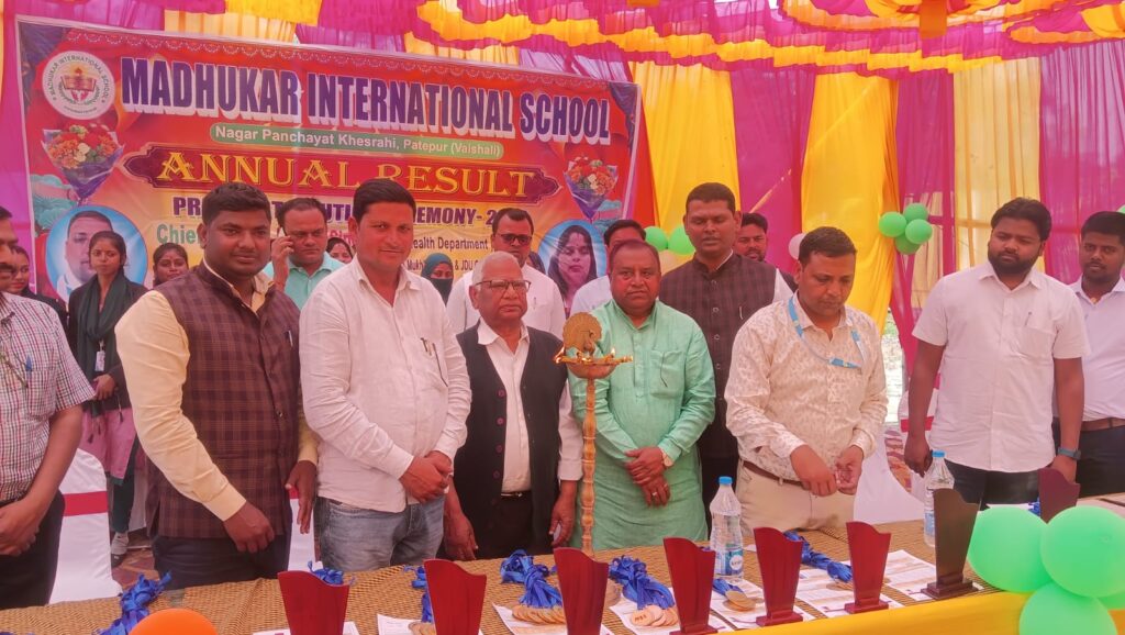 वैशाली, पातेपुर नगर पंचायत के खेसराही लगन चौक स्थित मधुकर इंटरनेशनल स्कूल के प्रांगण में भव्य समारोह का आयोजन कर वार्षिक परिक्षा का परिणाम घोषित किया गया। समारोह का विधिवत उद्घाटन मुख्य अतिथि पुर्व मुखिया इंजिनियर मनोज कुमार, सेवानिवृत्त सिविल सर्जन डाक्टर केपी सिंह, मुखिया गरीबनाथ आलोक,उप मुख्य पार्षद रविरंजन , मुखिया दीलीप कुमार, स्कूल के निदेशक प्रभात मधुकर, प्राचार्य जानकी कुमारी आदि के द्वारा संयुक्त रूप से दीप प्रज्वलित कर किया गया। कार्यक्रम में छात्र छात्राओं को मेडल, शील्ड, सर्टिफिकेट देकर प्रोत्साहित किया गया।