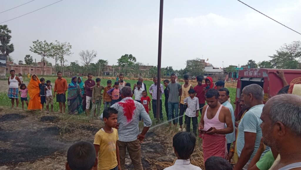 विजली के शॉट सर्किट से गेहूं के खेत मे आग लग जाने के कारण लगभग लग भग 10 कठ्ठे गेहूं की फसल बर्बाद हो गया