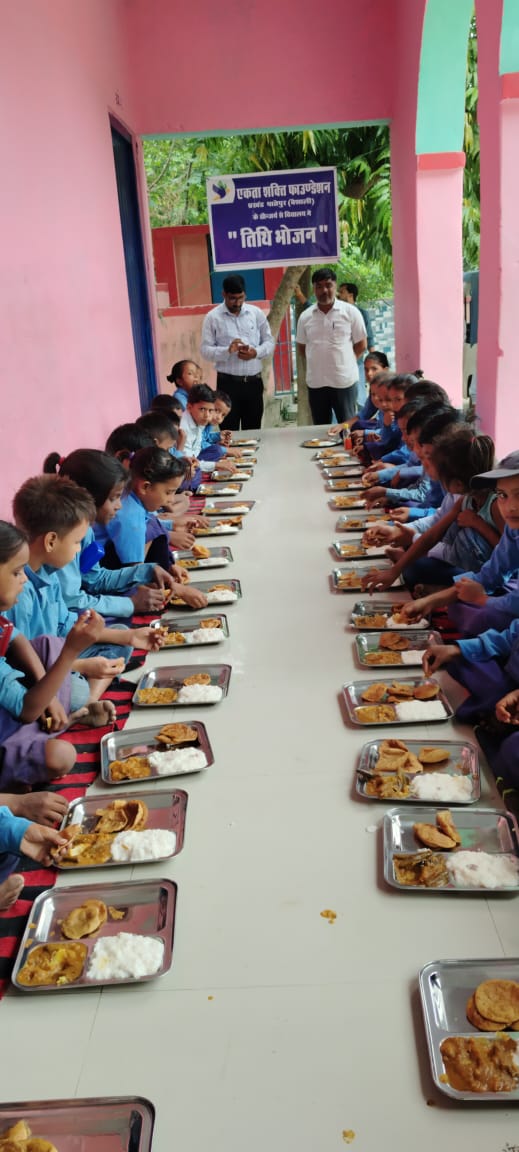 तिथि भोजन के दौरान मध्याह्न भोजन में बच्चों ने खायी खीर- पूड़ी सब्जी