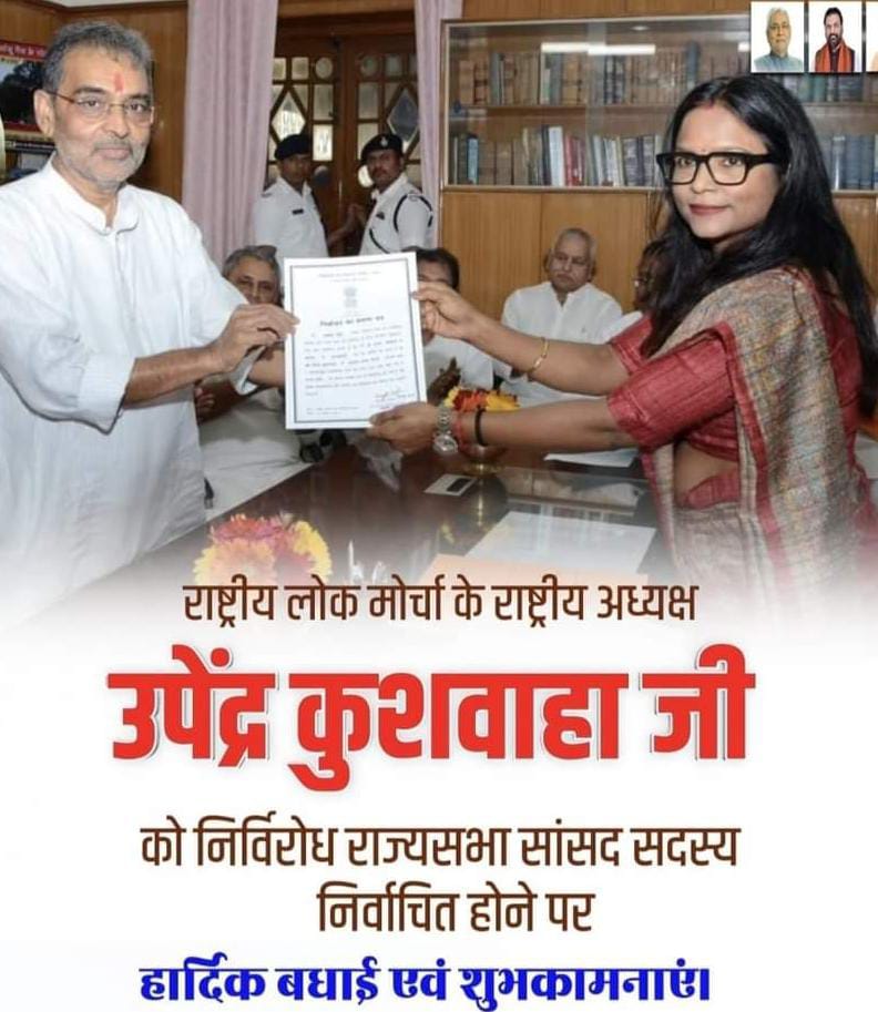 वैशाली (हाजीपुर )राष्ट्रीय लोक मोर्चा के प्रमुख पूर्व केंद्रीय मंत्री उपेंद्र कुशवाहा के राज्यसभा के सदस्य के रूप में निर्विरोध चुने जाने पर कार्यकर्ताओं ने हर्ष व्यक्त करते हुए बधाई दी है। आशा की है कि उनके कुशल नेतृत्व में पार्टी तथा राज्य व देश का विकास होगा। उपेंद्र कुशवाहा एनडीए घटक दल के नेता है। विगत लोकसभा चुनाव में काराकाट निर्वाचन क्षेत्र से एनडीए के उम्मीदवार थे लेकिन दुर्भाग्य बस उन्हें हार का सामना करना पड़ा था, तभी से कयास लगाए जा रहे थे की उपेंद्र कुशवाहा राज्यसभा भेजे जाएंगे और यही सच हुआ ।उन्हें एनडीए घटक दल ने राज्यसभा का उम्मीदवार बनाया और वे निर्विरोध निर्वाचित भी हुए ।उनके निर्वाचित होने पर खुशी का इजहार करते हुए पार्टी के नेताओं और कार्यकर्ताओं में बधाई दी है। बधाई देने वालों में महुआ क्षेत्र से मनोज कुमार राय, अकील देव सिंह ,उमेश कुशवाहा , हुलास सिंह ,प्रोफेसर दुख हरण सिंह, कृष्णनंदन सिंह ,रामसेवक सिंह, रणधीर कुमार सिंह, प्रोफेसर सरोज कुमार उर्फ लाला सिंह, दिनेश पासवान, वहीं जिला अध्यक्ष लालदेव राम ,नागेश्वर राय, कमल प्रसाद सिंह ,बजेंद्र कुमार पप्पू ,वरुण पासवान सहित दर्जनों शामिल है।