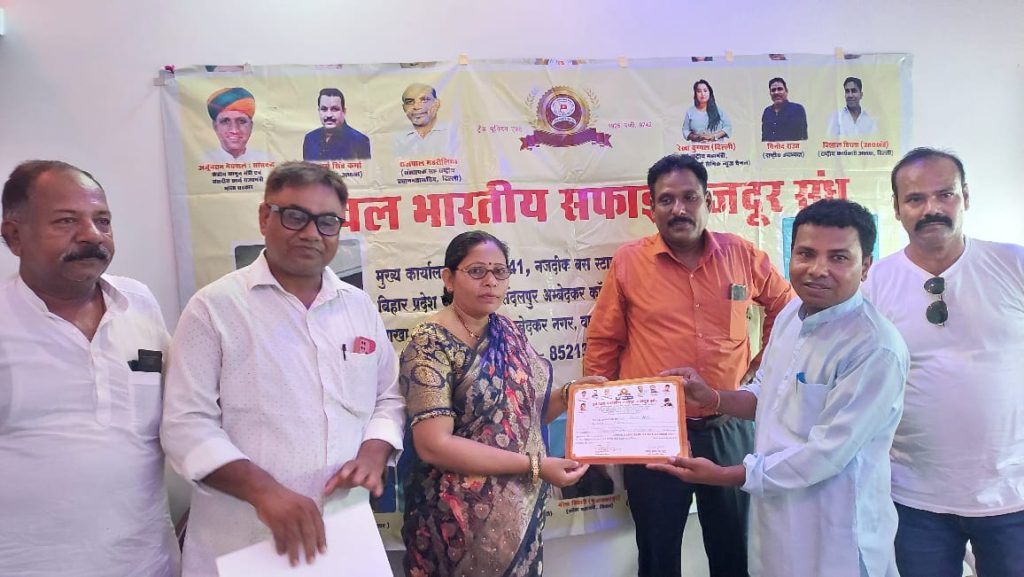 बिहार पटना। उपस्थित हुए। कार्यक्रम को संबोधित करते हुए। प्रदेश अध्यक्ष श्री रावत ने बताया कि। हाजीपुर लोकसभा से प्रत्याशी। डॉ सुरेंद्र कुमार। को वैशाली जिला के। कार्यकारी जिला अध्यक्ष। के रूप में मनोनीत किया। गया है। तथा साथ में ही। लोकसभा के चुनाव अभिकर्ता। समाजसेवी श्रीमती विमला देवी। जी को। महिला प्रकोष्ठ वैशाली के जिला अध्यक्ष। के पद पर मनोनीत किया गया। कार्यक्रम को संबोधित करते हुए। प्रदेश अध्यक्ष श्री राजू रावत जी ने बताया कि। सरकार 2012 में। सफाई कर्मी के नियमित बहाली। को बंद कर दी है। अब एनजीओ के माध्यम से। ठेका पर बहाली की जाती है। जो गरीब मजदूर के। हक और अधिकार का। हनन होता जा रहा है। ऐसा स्थिति रहा तो। आने वाला।