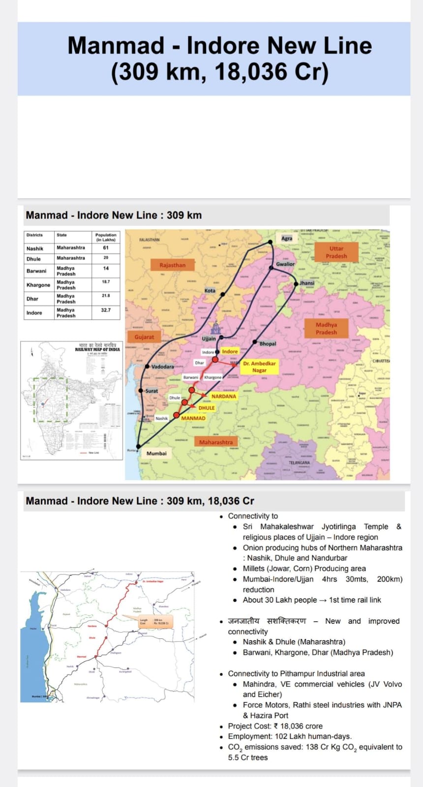 मुंबई और इंदौर के बीच सबसे छोटा रेल सम्पर्क प्रदान करने के लिए 309 किलोमीटर लंबी नई रेलवे लाइन परियोजना को मंजूरी दी