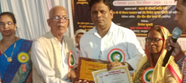 हाजीपुर (वैशाली) जिले के वैशाली प्रखंड अंतर्गत शांति शिक्षण प्रशिक्षण संस्थान केशोपुर,वैशाली के सभागार में मानव सांस्कृतिक संवर्धन संस्थान द्वारा राष्ट्र सम्मान समारोह 2024 एवं “राष्ट्र निर्माण में विभिन्न वर्गों का योगदान ” विषय पर सेमिनार का आयोजन शिक्षाविद एवं समजिक कार्यकर्ता प्रो.(डॉ.) विनय पासवान के नेतृत्व में किया गया । जिसकी अध्यक्षता आचार्य प्रवर निरंजन एवं उद्घाटन देश और दुनिया में कैंसर रोग विशेषज्ञ के रूप में चर्चित व्यक्तित्व पद्मश्री जितेन्द्र कुमार सिंह,मधुबनी पेन्टिग के क्षेत्र में चर्चित व्यक्तित्व पद्मश्री शांति देवी एवं पद्मश्री शिवन पासवान,विशिष्ट अतिथि डॉ. पी.सी. चन्द्रा थाईलैंड,डॉ.शशिभूषण कुमार (सम्पादक)मानवाधिकार टुडे, प्रो.(डॉ.)ललित प्रभा विभागाध्यक्ष (अंग्रेजी विभाग)एम.एस.के.बी. कॉलेज मुज़.,डॉ.मुकेश कुमार व्याख्याता,प्रो.सुधीर मालाकार, एवं डॉ.विनय पासवान द्वारा संयुक्त रूप से दीप प्रज्वलित कर किया गया । सभी आगंतुकों का संस्थान के बच्चियों द्वारा तिलक- चन्दन,पुष्प वर्षा एवं पुष्प भेंट कर के अभिनन्दन किया गया । स्वागत गीत रागिनी कुमारी, आँचल कुमारी, शायमा,सालेहा ने गाया ।उपस्थित वक्ताओं ने “राष्ट्र निर्माण में विभिन्न वर्गों के योगदान” पर अपना वक्तव्य रखा । इस कार्यक्रम को बच्चों के सांस्कृतिक कार्यक्रम ने सभी का मन मोह लिया । राजनंदिनी के निर्देशन में में वन्दे भारती गाने पर समूह नृत्य वैनवी,वीरा,आराधना,शालू,सिद्धि,अर्चना,अर्पणा द्वारा प्रस्तुत किया गया । इस कार्यक्रम में मुख्य रूप से राष्ट्र निर्माण में विभिन्न क्षेत्रों मुख्यतः समाजसेवा, कृषि शिक्षा,पत्रकारिता, चिकित्सा,साहित्य एवं लेखन,रोज़गार,सेना आदि में उत्कृष्ट कार्य के लिए कुल 51 लोगों को बैच,मोमेंटो,अंग वस्त्र एवं “राष्ट्र निर्माता सम्मान पत्र” से सम्मानित किया गया। मंच का संचालन मशहूर साहित्यकार एवं लेखक सतीश कुमार साथी एवं रत्नेश कुमार सेवा निवृत शिक्षक द्वारा किया गया । सम्मान पाने वालों में मुख्य रूप से दीपक श्रीवास्तव,प्रभात कुमार,अनिल सिंह,अजित कुमार,श्याम किशोर भारती,रणधीर पासवान को पत्रकारिता , लालदेव कुशवाहा,चंदेश्वर पटेल,संदीप सागर,अमरजीत कुमार प्रखंड विकास पदाधिकारी कुढ़नी,मुज़.,शशि भूषण सिंह,फादर प्रणोय को समाज सेवा, प्रो.सुनील कुमार सिंह,प्रो.रघुनाथ प्रसाद सिंह,प्रो.बिमल राय,ओमप्रकाश पंकज,मो.सज्जाद आलम,शिव बालक पासवान,भोला पासवान,उपेंद्र कुमार ठाकुर,वासुदेव पासवान आदि को शिक्षा के क्षेत्र में डॉ.शशि कुमार पटना चिकित्सा के क्षेत्र में अनिल कुमार शिक्षक चकगुलामुद्दीन +2 हाई स्कूल डॉ. सतीश कुमार साथी को साहित्य एवं लेखन के क्षेत्र में उत्कृष्ट यो