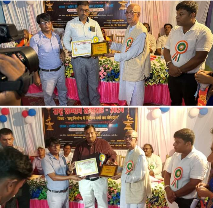 राष्ट्र निर्माता सम्मान से नवाजे गए बालेश्वर सिंह सुदामा देवी महाविद्यालय की निदेशक सुनील कुमार सिंह । (प्राचार्य रघुनाथ प्रसाद सिंह भी राष्ट्र निर्माता सम्मान से सम्मानित हुए )