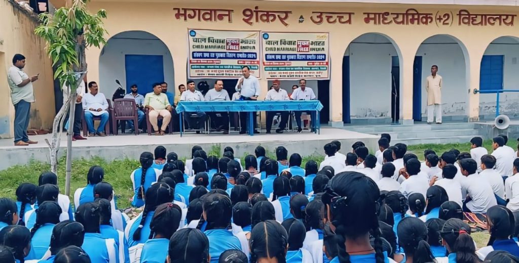 बाल विवाह मुक्त भारत अभियान के तहत लालगंज के भगवान शंकर उच्चतर माध्यमिक विद्यालय में स्वर्गीय कन्हाई शुक्ला सामाजिक सेवा संस्थान वैशाली द्वारा आयोजित प्रतियोगिता के सफल छात्र-छात्राओं के बीच संकल्प सभा सह पुरस्कार वितरण समारोह का आयोजन किया गया। कार्यक्रम का उद्घाटन करते हुए स्वर्गीय कन्हाई शुक्ला सामाजिक सेवा संस्थान के सचिव सुधीर कुमार शुक्ला ने कहा कि बाल विवाह मुक्त भारत अभियान के तहत वैशाली जिले के विभिन्न संस्थाओं में बच्चों के बीच प्रतियोगिता का आयोजन किया जा रहा है। जिससे बाल विभाग के दुष्परिणामों के प्रति बच्चों को जागरूक किया जा सके तथा जिले में बाल विवाह जैसे कुरिति को संपूर्ण खत्म किया जा सके। इस दिशा में संस्था द्वारा लगातार प्रयास किया जा रहा है । अच्छे परिणाम भी आ रहे हैं। सैकड़ो की संख्या में बाल विवाह इस वर्ष रोकी गई है। विदित हो कि विद्यालय में बाल विवाह मुक्त भारत अभियान के तहत समाज में फैले बाल विवाह जैसे कुरीतियों के विरुद्ध संदर्भित विषय पर चित्रकला स्लोगन और निबंध लेखन प्रतियोगिता का आयोजन किया गया। चित्रकला प्रतियोगिता में प्रथम स्थान के लिए मसीहत प्रवीण,द्वितीय स्थान के लिए शिखा सुमन और तृतीय स्थान के लिए आयुष कुमार को सम्मानित किया गया। निबंध लेखन प्रतियोगिता में क्रमशः मासूमा प्रवीण को प्रथम तनु कुमारी को द्वितीय और तृतीय स्थान के लिए सना प्रवीण को चुना गया।वहीं स्लोगन प्रतियोगिता में प्रियांशी कुमारी को प्रथम,अनुष्का कुमारी को द्वितीय और तृतीय स्थान के लिए सिद्धि कुमारी को प्रशस्ति पत्र और शील्ड देकर सम्मानित किया गया।साथ ही प्रतियोगिता में शामिल अन्य लगभग 400 छात्र /छात्राओं को प्रशस्ति पत्र देकर सम्मानित किया गया। कार्यक्रम की अध्यक्षता विद्यालय के प्रधानाचार्य मोहम्मद नसीम अख्तर द्वारा किया गया।कार्यक्रम में स्व. कन्हाई शुक्ला सामाजिक सेवा संस्थान के संतोष कुमार, अमरेश कुमार,शिक्षक संजय कुमार, हेमंत कुमार, अजीत कुमार,पंकज कुमार, संध्या कुमारी,निशा कुमारी, उमेश कुमार, प्रणव कुमार सहित विद्यालय के सभी छात्र-छात्राएं मौजूद थे।