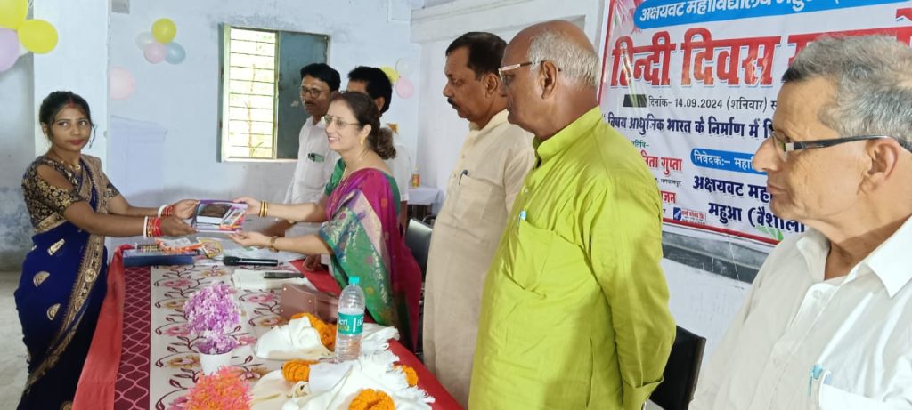 यहां आधुनिक भारत के निर्माण में हिंदी की भूमिका विषय पर अतिथियों ने अपने व्याख्यान दिए। मुख्य अतिथि के रूप में पहुंचे एलएन कॉलेज भगवानपुर की प्रचार्या प्रो डॉ सुनीता गुप्ता, हिंदी के पूर्व विभागाध्यक्ष प्रो डॉ रणवीर राजन ने हिंदी को हर पग पर सम्मान कर इसे अपनाने को कहा। इस मौके पर उन्होंने इस दिवस को हिंदी अपनाओ संकल्प दिवस के रूप में मनाने की भी अपील की। उन्होंने कहा कि हिंदी अपने आप में समृद्ध और सम्मान देने वाली भाषा है। मौके पर उपस्थित ललित कुमार घोष ने हिंदी को सम्मान करने और विभिन्न जगहों पर इसे इस्तेमाल करने की नसीहत दी। कॉलेज के प्रभारी प्राचार्य प्रो पहवारी लाल यादव की अध्यक्षता और हिंदी विभाग के विभागाध्यक्ष प्रो डॉ राज किशोर ठाकुर के संचालन में समारोह को पूर्व प्राचार्य वीरेंद्र किशोर सिंह के अलावा प्रो बीरेंद्र प्रसाद राय, प्रो भरत प्रसाद, प्रो चंदेश्वर राय, सुरेश ठाकुर, प्रो अशोक कुमार, प्रो अमिताभ, प्रो डॉ प्रेम प्रकाश राय, प्रो डॉ संजय गुप्ता, प्रो डॉ मीना कुमारी, प्रो रामनंदन राय, प्रो अनिता कुमारी, वीरेंद्र प्रसाद सिंह आदि ने भी अपने विचार रखें। हिंदी से ऑनर्स कुमारी माल्या, सिमरन सिंह, लक्ष्मी कुमारी, साक्षी सिंह, नास्का निहार फातिमा, ब्यूटी कुमारी, जुली कुमारी, मधु कुमारी, कुमारी कल्पना, राधिका आदि को हिंदी व्याख्यान, सरस्वती वंदना व स्वागत गान के लिए पुरस्कृत किया गया। धन्यवाद ज्ञापन प्रभारी प्राचार्य ने किया। उधर एनएन कॉलेज सिंघाड़ा, सेंट जॉन्स एकेडमी मानपुरा, संत जोसेफ स्कूल सिंघाड़ा आदि पर भी हिंदी दिवस समारोह मनाया गया।