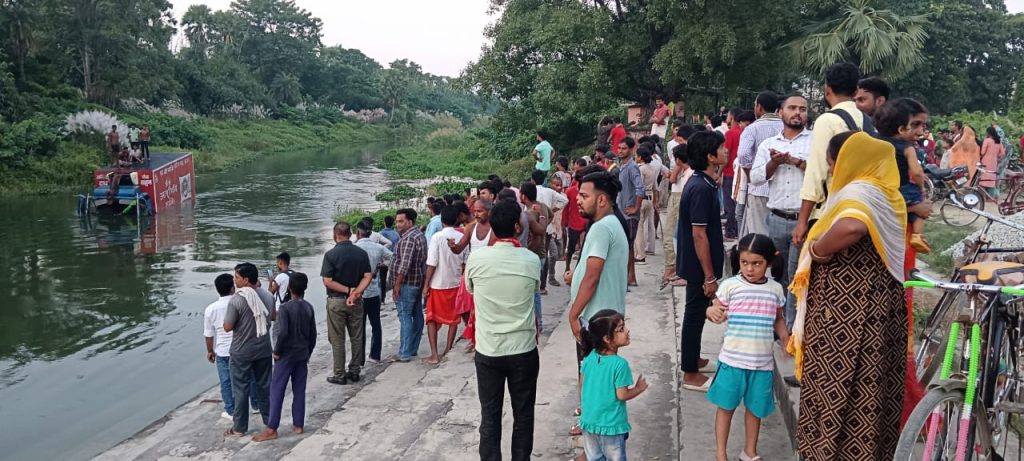 बताया जा रहा है कि पहाड़पुर की ओर से मंगरू चौक की तरफ आ रहे एक कंटेनर के चालक दूसरे वाहन के चकमे में आकर संतुलन खो दिया। इस दौरान गाड़ी करीब 20 फीट गहरी नदी में पलट गई। हल्ला हुआ और लोगों की भी उमड़ पड़ी। इस बीच नदी में पलटी गाड़ी उपलाते हुए आधा किलोमीटर दूर सती स्थान जा पहुंची। जहां कुछ तारकों ने उसे रस्सी से बांधकर स्थिर कर दिया। लोगों ने बताया कि गाड़ी अनियंत्रित होकर नदी में गिरते समय चालक गेट खोलकर कूद गया। जिसके कारण उसकी जान बच गई। हालांकि लोगों का यह भी कहना था की गाड़ी में खलासी या और सवार थे। यह जानकारी नहीं मिल पाई है। गाड़ी से कूदने के बाद चालक कहीं छुप गया। सूचना पर डायल 112 भी पहुंची।