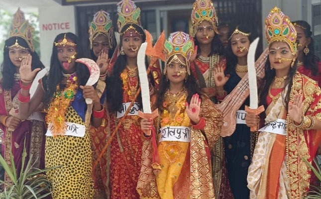 महुआ (वैशाली )क्षेत्र के सृजन पब्लिक स्कूल ,छतवारा के छात्राओं ने मां भगवती के नौ स्वरूपों की झांकी निकाल करके लोगों को दिव्य दर्शन दिए ।विभिन्न परिधानों में सजी नवदुर्गा के शैलपुत्री, ब्रह्मचारिणी, महागौरी ,स्कंदमाता , कात्यायनी सहित अन्य रूपों में सजी छात्राएं बड़ा ही आकर्षक और मनोरम लग रही थी। इस मौके पर उपस्थित लोगों ने छात्राओं द्वारा बने माता के विभिन्न स्वरूपों का दर्शन किए ।वैसे भी शारदीय नवरात्रि के नौ वें दिन कन्या पूजन की विधि विधान है ।जिसमें दुर्गा के नौ स्वरूपों की पूजा अर्चना की जाती है। कार्यक्रम की जानकारी देते हुए विद्यालय के प्राचार्य डी के सिंह ने बताया बच्चों में अपनी सांस्कृतिक विरासत को जानकारी देने के लिए यह विभिन्न रूप की झांकी निकाली निकल गई है। विभिन्न स्वरूपों में सजी छात्राएं भी बहुत प्रसन्नचित और भाव मुद्रा में दिख रही थी। इसमें भाग लेने वाली छात्राएं निधि कुमारी मां दुर्गा के रूप में नजर आए,नव्या सिंह मां शैलपुत्री ,प्रतिज्ञा मां ब्रह्मचारिणी,आकृति मां कात्यायनी , अमृती मां महागौरी , प्रियंका मां स्कंदमाता , संध्या मां चंद्रघंटा, निशा मां कुष्मांडा ,सोनाली मां कालरात्रि, एवम श्रृष्टि मां सिद्धदात्री के अलौकिक रूप में नजर आई।