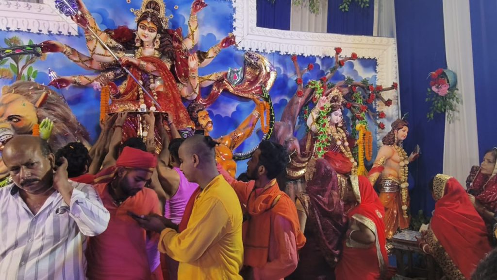 हाजीपुर (वैशाली) जिले के सभी हिस्सों में मां भगवती देवी दुर्गा के पट खुलते ही श्रद्धालुओं की भारी भीड़ उमड़ पड़ी। बताते चले की नौ दिवसीय शारदीय नवरात्रि के मौके पर पंचमी तिथि को गोविंदपुर सिंघाड़ा शक्तिपीठ सहित कई स्थानों पर मां भगवती के पट खुल गए थे ,जबकि अधिकांश जगहों पर सप्तमी तिथि को मां भगवती के पट खुले। सभी जगह पर मां भगवती की जय जयकारों से पूजा पंडाल गूंज रहे थे। महुआ प्रखंड क्षेत्र के महुआ ,छतवारा ,कुशहर , बरहर चौक समसपुरा,भवानी चौक, जहांगीरपुर सलखनी, डोगरा, कन्हौली, मधौल ,प्रेमराज, गोरौल, चेहराकला ,पातेपुर, मौदह बुजुर्ग , मंडईडीह, जंदाहा, अंधराबर चौक , सहदेई , महनार, देसरी ,बिदुपुर, राघोपुर, हाजीपुर, लालगंज ,वैशाली ,भगवानपुर, राजापाकर सहित अन्य जगहों पर मेले का आयोजन किया गया है। जहां पर श्रद्धालु अपने पूरे परिवार सहित मां भगवती के दर्शन कर रहे हैं और मेला का आनंद उठा रहे हैं। सभी पूजा पंडालों में सांस्कृतिक कार्यक्रम नाटक, नाच का आयोजन किया गया है, जहां दर्शन सांस्कृतिक कार्यक्रम का आनंद ले रहे हैं।