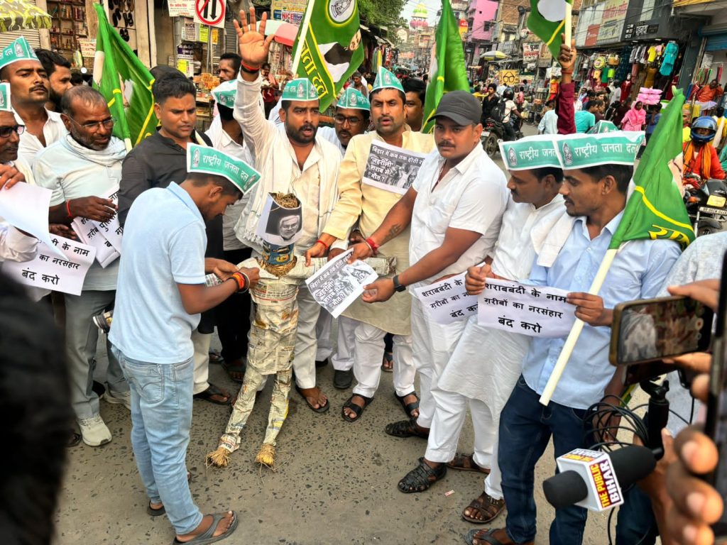 बिहार मे ज़हरीली शराब से मौत के विरूद्ध में आज हाजीपुर के गांधी चौक पर युवा राजद के प्रदेश महासचिव निर्दोष यादव के नेतृत्व राजद नेताओं ने बिहार के मुख्यमंत्री का पुतला दहन किया और सरकार के विरोध में नारे लगाये मीडिया से बात करते हुए युवा राजद नेता निर्दोष यादव ने बताया की बिहार में शराबबंदी फेल है जिस तरह से पुलिस-प्रशासन के सहयोग से और सत्ता में बैठे नेताओं के शह पर बिहार के लोगों को ज़हरीली शराब बेची जा रही है गरीब लोग ज़हरीली शराब पीकर अपनी जान गवा रहे है अब तो बिहार में शराब के अलावा कोटा और स्मैक पीकर छोटे छोटे बच्चे अपना भविष्य बर्बाद कर रहे हैं सरकार नशा पर लगाम लगाने में पुरी तरह से फेल है सरकार को बिहार के लोगों की कोई चिन्ता ही नहीं है हम सरकार से माँग करते हैं की शराबबंदी सही तरीक़े से लागू करे और मृतक के परिजनों को 20 लाख रुपये का मुआवज़ा दे और दोषी पुलिस-प्रशासन को कड़ी से कड़ी सजा दे कार्यक्रम में मुख्य रूप से राजद नेता राकेश रमण चौबे,मुखिया राजीव रंजन यादव,लखेन्दर दास,बलराम गिरी,रामलाल राय,शिक्षक रामबली राय,जितेंद्र यादव,मो.शदान खान,सरोज यादव,वशिष्ठ राय,अमोद चौरसीया,जसीम अहमद,रणधीर यादव,पैक्स अध्यक्ष कन्हैया लाल सिंह,डा अरुण सिंह,सौरभ यादव,तेजनारायण साह,छोटू यादव,शिवप्रसाद राम,सुबोध यादव,अभिमन्यु यादव,यादव,सरपंच रणवीर यादव,रूद्रमणी, मंजय पासवान,राजीव रावत,निक्कू यादव,अजय यादव,अरविंद पासवान सहित सैकड़ों कार्यकर्ता