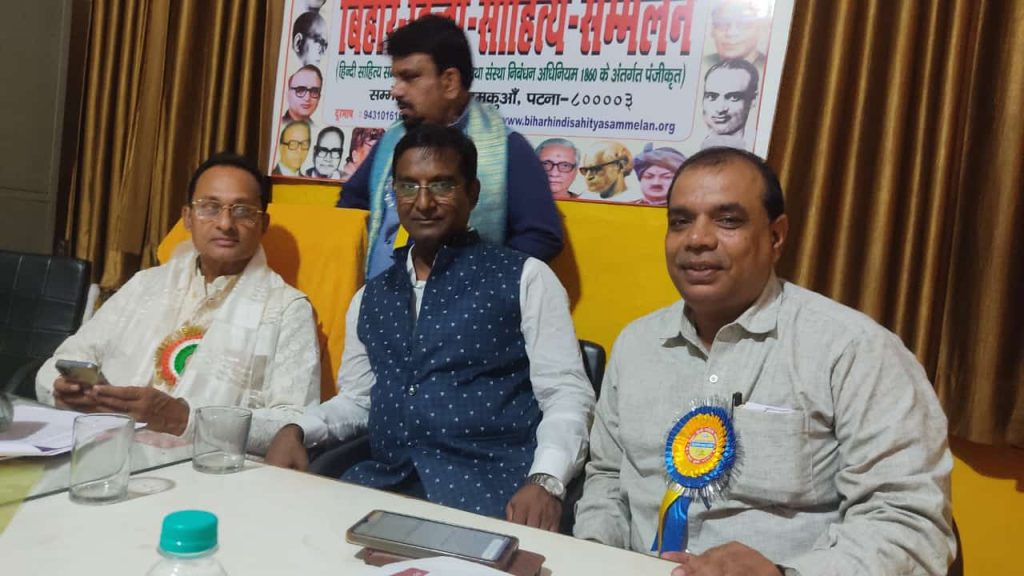 बिहार हिंदी साहित्य सम्मेलन में पटना के मेयर श्री मति सीता साहु जी के साथ पटना गुरु द्वारा कमिटी के अध्यक्ष सरदार महिंदर् पाल सिंह ढिल्लंन प्रसिद्ध बॉलीवुड लेखक, निर्देशक, इरफान जामियावाला, शशि भूषण जी, विपुल जी, लोजपा नेता राजीव भट्ट जी और बिहार हिंदी साहित्य के अध्यक्ष डॉक्टर अनिल सुलभ जी, न्याय मूर्ति रवि रंजन जी झारखंड ने कार्यक्रम में भाग लिया और हिंदी की गरिमा को आगे बढ़ाया सभी ने भारत में हिंदी की लचर स्तिथि पे प्रकाश डाला, इस अधिवेशन में लगभग 300 साहित्यकार देश के अलग अलग हिस्से से आये और हिंदी भाषा को उत्कृष्ट बनाने के लिए अहम सुझाओ भी दिया।।