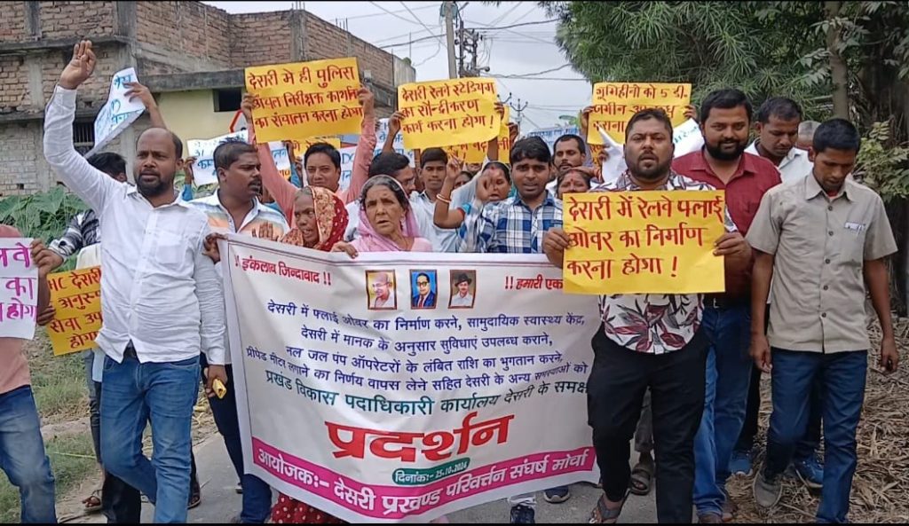 देसरी में महुआ चांदपुर पथ पर सोनपुर रेल मंडल अंतर्गत बछवाड़ा हाजीपुर रेल खंड पर फ्लाई ओवर ब्रिज का निर्माण कराने, देसरी रेलवे स्टेडियम का सौन्द्रीकरण कार्य कराने, देसरी स्टेशन के उत्तर दिशा में भूखंड पर पार्किंग सेवा टिकट काउंटर पार्क बनाने, प्रीपेड स्मार्ट बिजली मीटर लगाने का निर्णय वापस लेने, सामुदायिक स्वास्थ्य केन्द्र देसरी में मानक के अनुरुप स्वास्थ्य सेवा उपलब्ध कराने, भाड़े के मकान में संचालित खोकसा, ममरेजपुर उफरौल सहित अन्य स्वास्थ्य उपकेन्द्र का भवन निर्माण करने, अतिरिक्त प्राथमिक स्वास्थ्य केन्द्र गाजीपुर का पूर्ण रुपेण संचालन करने, पल-जल जलापूर्ति योजना में होनेवाली खराबी को निर्धारित समय में ठीक कराने, नल-जल पम्प ऑपरेटरों के लंबित राशि भुगतान शीघ्र करने, प्रखण्ड स्तर पर कचरा का निष्पादन सुनिश्चित करने, देसरी पुलिस अंचल निरीक्षक कार्यालय को महनार कैम्प के बदले देसरी से ही संचालित करने, प्रखण्ड कार्यालय का संचालन स्वयं के भवन निर्माण कर करने, नवसृजित प्राथमिक विद्यालय देसरी कॉपरेटिव के पास को अपने पूर्व स्थान पर लाने, वृद्धावस्था पेंशन एवं समाजिक सुरक्षा पेंशन की राशि बढ़ाकर 6000 करने, आवास योजना, राशन कार्ड एवं दाखिल खारिज में व्याप्त भष्ट्राचार पर रोक लगाने, भूमिहीनों को पाँच डी० जमीन उपलब्ध कराने को लेकर पंद्रह सूत्री मांगों पर देसरी प्रखंड परिवर्तन संघर्ष मोर्चा ने प्रखंड कार्यालय पर प्रदर्शन किया।