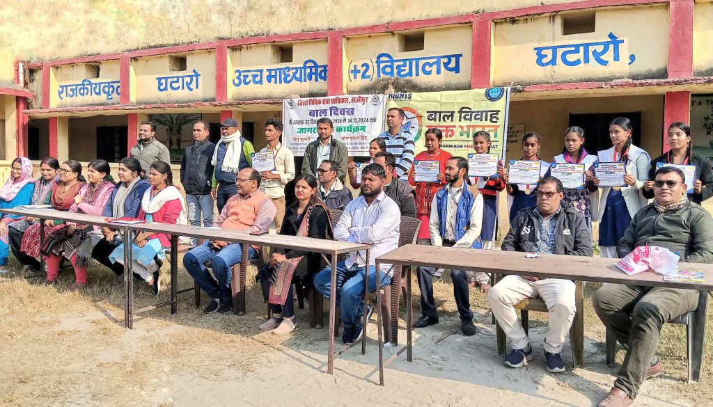 जिला विधिक सेवा प्राधिकार वैशाली और स्वर्गीय कन्हाई शुक्ला सामाजिक सेवा संस्थान के संयुक्त तत्वावधान में लालगंज के घटारो उच्च माध्यमिक विद्यालय में संकल्प सभा सह पुरस्कार वितरण कार्यक्रम का आयोजन किया गया। कार्यक्रम जस्ट राइट्स फॉर चिल्ड्रन के डायरेक्टर सह स्वर्गीय कन्हाई शुक्ला सामाजिक सेवा संस्थान के सचिव सुधीर कुमार शुक्ला के निर्देश पर अधिकार मित्र संतोष कुमार, अमरेश कुमार राजू और प्रोजेक्ट कोऑर्डिनेटर शालिनी भारती के संयुक्त नेतृत्व में किया गया।”बाल विवाह मुक्त भारत” अभियान के तहत आयोजित कार्यक्रम में बच्चों को चित्रकला,निबंध लेखन और स्लोगन प्रतियोगिता के सफल प्रतिभागियों के बीच प्रशस्ति पत्र और मेडल देकर सम्मानित किया गया। कार्यक्रम की अध्यक्षता विद्यालय के प्रभारी प्रधानाध्यापक नीरज कुमार ने की । चित्रकला प्रतियोगिता में प्रथम स्थान के लिए ज्योति कुमारी को चुना गया, वहीं द्वितीय स्थान के बन्दना कुमारी और तृतीय स्थान पर राजनंदनी रही। निबंध लेखन प्रतियोगिता में क्रमशः प्रथम द्वितीय और तृतीय स्थान के लिए बन्दना ,तनीषा और दिव्या चुनी गई।स्लोगन प्रतियोगिता में साहिल प्रथम,पायल द्वितीय और तृतीय स्थान राजलक्ष्मी ने प्राप्त किया।इस दौरान कार्यक्रम के डायरेक्टर सह स्वर्गीय कन्हाई शुक्ला सामाजिक सेवा संस्थान के सचिव सुधीर कुमार शुक्ला ने बताया कि हम सभी का उद्देश्य है कि वैशाली जिले को बाल विवाह मुक्त जिला बनाया जाए।इस दिशा में पुलिस प्रशासन,जिला प्रशासन और सामाजिक संगठनों के लोग पूरी तत्परता से कार्य कर रहे हैं। वर्ष 2030 तक भारत को पूर्ण रूप से बाल विवाह मुक्त राष्ट्र बनाने का लक्ष्य रखा गया है। कार्यक्रम में बच्चों को बाल अधिकारों से संदर्भित विषय जैसे बाल विवाह,बाल मजदूरी,बाल यौन शोषण और बाल तस्करी के संबंध में विस्तृत जानकारी दी। गई। कार्यक्रम में शिक्षिका सनिग्धा वर्मा,पूनम कुमारी,सोनम कुमारी,अमित कुमार,शिवानी, रिंकी कुमारी,बाबू साहेब,सुमन सिंह अवधेश कुमार, शिवसागर शर्मा आदि मौजूद थे।