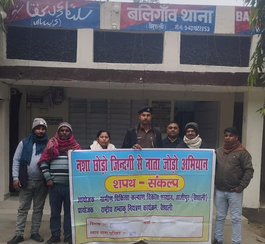 बालीगांव थाना अध्यक्ष। महोदय। द्वारा कराया गया शपथ संकल्प। आज दिनांक 7 जनवरी 2025 को। बालीगांव थाना परिसर पर। नशा छोड़ो जिंदगी से नाता जोरो अभियान के तहत थाना अध्यक्ष महोदय द्वारा शपथ संकल्प कराया गया। कार्यक्रम के संचालन संस्थान के कोषाध्यक्ष। डॉ विमला कुमारी। द्वारा किया गया। कार्यक्रम के बारे में। मुख्य अतिथि डॉक्टर सुरेंद्र कुमार ने बताया कि। 2011 से वैशाली जिला में कोटपा अधिनियम लागू है। जिसके तहत पान। गुटखा खैनी। पर प्रतिबंध किया गया है। कानून के उल्लंघन करने वाले लोगों के खिलाफ। पुलिस प्रशासन शक्ति से। नियम को लागू करेंगे। इसके लिए जागरूकता अभियान चलाया जा रहा है।
