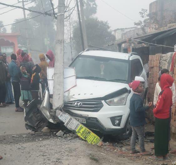अनियंत्रित कार ने हाई वोल्टेज विद्युत पोल में मारी भीषण टक्कर, उड़ें पड़खच्चे
