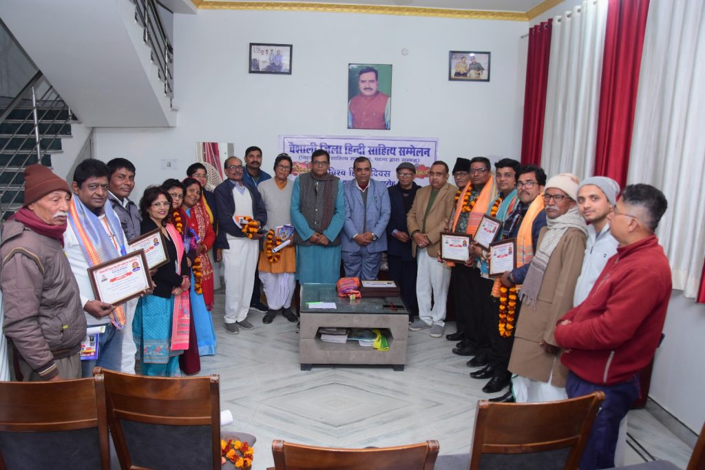 वैशाली जिला हिन्दी साहित्य सम्मेलन द्वारा विश्व हिंदी दिवस के उपलक्ष में कवि सम्मेलन सह स्मृति सम्मान समारोह 2025 का भव्य आयोजन किया गया। इस समारोह का उद्घाटन वैशाली जिला के पूर्व न्यायधीश श्री दिनेश कुमार शर्मा एवं अध्यक्षता वैशाली जिला हिन्दी साहित्य सम्मेलन के अध्यक्ष डॉ शशि भूषण कुमार ने किया। मंच का संचालन मेदिनी कुमार मेनन एवं धन्यवाद ज्ञापन संगीता राय ने किया। 7 साहित्यकारों को स्मृति सम्मान 2025 ( विपिन चंद्र पटेल ‘विप्लवी’ को महावीर शर्मा ‘विप्लव’ स्मृति सम्मान, प्रो. रामजी राय को सारंग शास्त्री सम्मान,डॉ सुधांशु कुमार चक्रवर्ती को हरिहर प्रसाद चौधरी नूतन स्मृति सम्मान, विश्वजीत कुमार सिंह को डॉ पारस नाथ सिंह स्मृति सम्मान, पप्पु कुमार सिंह शौवान फारुकी स्मृति सम्मान, विश्वनाथ सिंह को प्रो. उमाकांत वर्मा स्मृति सम्मान एवं क्षितिज प्रकाश को डॉ0 दामोदर प्रसाद स्मृति सम्मान ) 5 लोगों को हिन्दी/साहित्य सेवी सम्मान 2025( गोविंद वल्लभ रमन,अभिषेक कुमार. नागेंद्र मनी. वीर मणी एवं अभय कुमार सिंह )से सम्मानित किया गया।दर्जनों कवियों ने हिंदी दिवस पर अपनी कविताओं का सस्वर पाठ किया और पूर्व न्यायधीश श्री दिनेश कुमार शर्मा ने शानदार गीतों को प्रस्तुति किये।कार्यक्रम में सरस्वति वंदना विवेका चौधरी,स्वागत भाषण अंजू सिंह एवं धन्यवाद ज्ञापन अलका श्री ने दिया। कामता प्रसाद सिंह,संगीता राय,अशोक राय,शंभू शरण मिश्र,हरिविलास राय,डॉ नंदेश्वर प्रसाद सिंह,डॉ शिव बालक राय प्रभाकर ने अपनी अपनी कविताओं को सुनाया और खूब तालियां बटोरी।