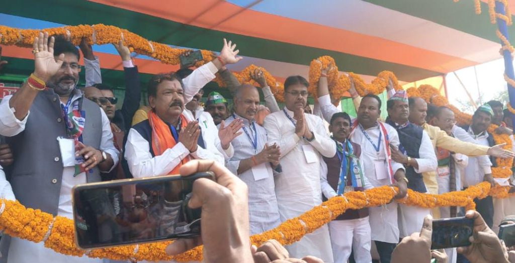 हाजीपुर (वैशाली ) अक्षयवट राय स्टेडियम में आयोजित राष्ट्रीय जनतांत्रिक गठबंधन “कार्यकर्ता सम्मेलन में सभी दल के नेता व कार्यकर्ता उपस्थित होकर अपनी एकता का परिचय दिया।इस अवसर पर सभी दल के प्रदेश अध्यक्ष एवं नेता उपस्थित थे। सम्मेलन का शुभारंभ भाजपा के प्रदेश अध्यक्ष डॉ. दिलीप जयसवाल एवं सभी घटक दलों के प्रदेश अध्यक्षों के साथ किया । एनडीए के समर्पित कार्यकर्ताओं को संबोधित कर संगठन की शक्ति और आगामी रणनीति पर मार्गदर्शन दिया। इस अवसर पर जदयू के प्रदेश अध्यक्ष उमेश कुशवाहा ,लोजपा (आर) के प्रदेश अध्यक्ष राजू तिवारी , हम के प्रदेश अध्यक्ष अनिल सिंह ,रालोमो के प्रदेश अध्यक्ष मदन चौधरी ,हाजीपुर के विधायक अवधेश सिंह ,पातेपुर के विधायक लखेंद्र पासवान, लालगंज के विधायक संजय सिंह , वैशाली के विधायक सिद्धार्थ पटेल ,पूर्व सांसद रामा किशोर सिंह,पूर्व केंद्रीय मंत्री दशई चौधरी ,विधान पार्षद गण,पूर्व विधायक गण एवं सम्मानित जनप्रतिनिधि एवं कार्यकर्ता उपस्थित थे।महुआ से जद यू प्रदेश महासचिव जागेश्वर राय के नेतृत्व में सैकड़ों कार्यकर्ताओं ने भाग लिया।वही जद यू नेत्री डॉक्टर आसमा परवीन , लोजपा नेता श्रीकांत पासवान ,भाजपा नेता रमैया सिंह,रालोमा नेता अकिल देव सिंह सहित अन्य नेताओं के नेतृत्व में सैकड़ों कार्यकर्ताओं ने भाग लिया।
