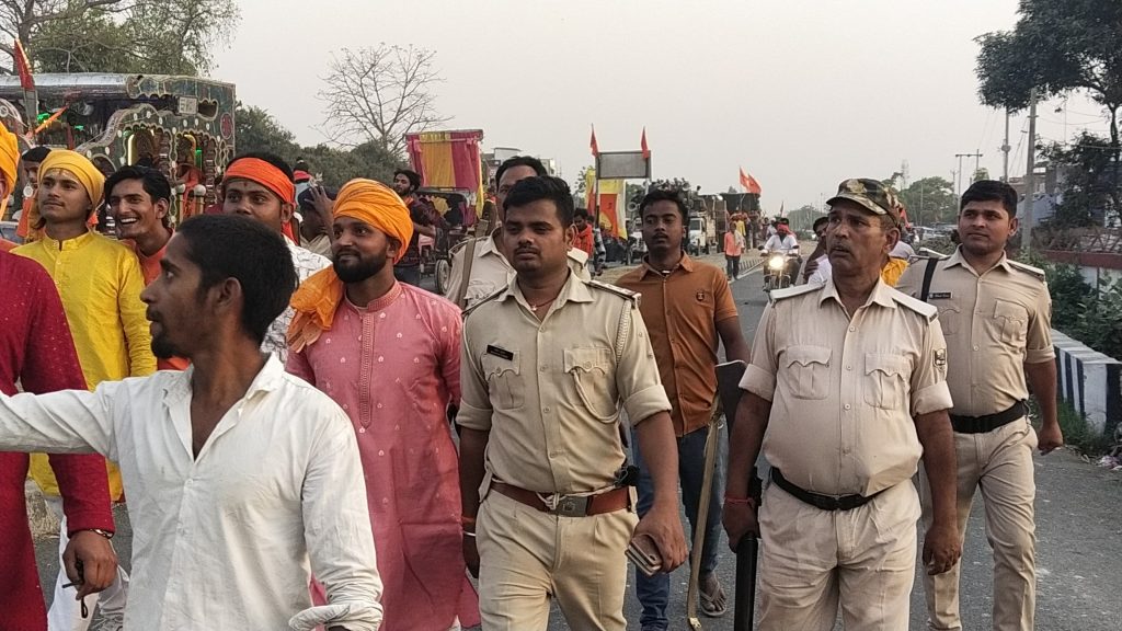 रामनवमी को लेकर निकाली गई शोभा यात्रा शांतिपूर्ण माहौल में हुआ सम्पन्न . क्षेत्र के गोरौल, हरशेर,कर्पूरी चौक, अंधारी गाछी, गोढ़ीया, बेलवर, सहित अन्य जगहों से निकाली गई शोभायात्रा कई किलोमीटर तक परिक्रमा करते हुए विभिन्न मठ मंदिरों पर पहुचा. शोभायात्रा में गाजे बाजे, के साथ दर्जनों घोड़े भी दौड़ रहे थे . उसके पीछे भगवान श्रीराम के मूर्ति को भी श्रद्धालु गाड़ी पर सजाकर चल रहे थे जो शोभायात्रा में चार चांद लगा रहा था. सुरक्षा को लेकर प्रखंड विकास पदाधिकारी उदय कुमार थानाध्यक्ष रौशन कुमार, बीओ , सुशील कुमार , सीओ अंसु कुमार अवर निरीक्षक प्रशांत कुमार, अभय शंकर सिंह, शैलेन्द्र कुमार,जयराम तिवारी, तनूजा कुमारी , उमाकांत सिंह, शिवम कुमारी सहित भारी संख्या में पुलिस बल लगे हुए थे