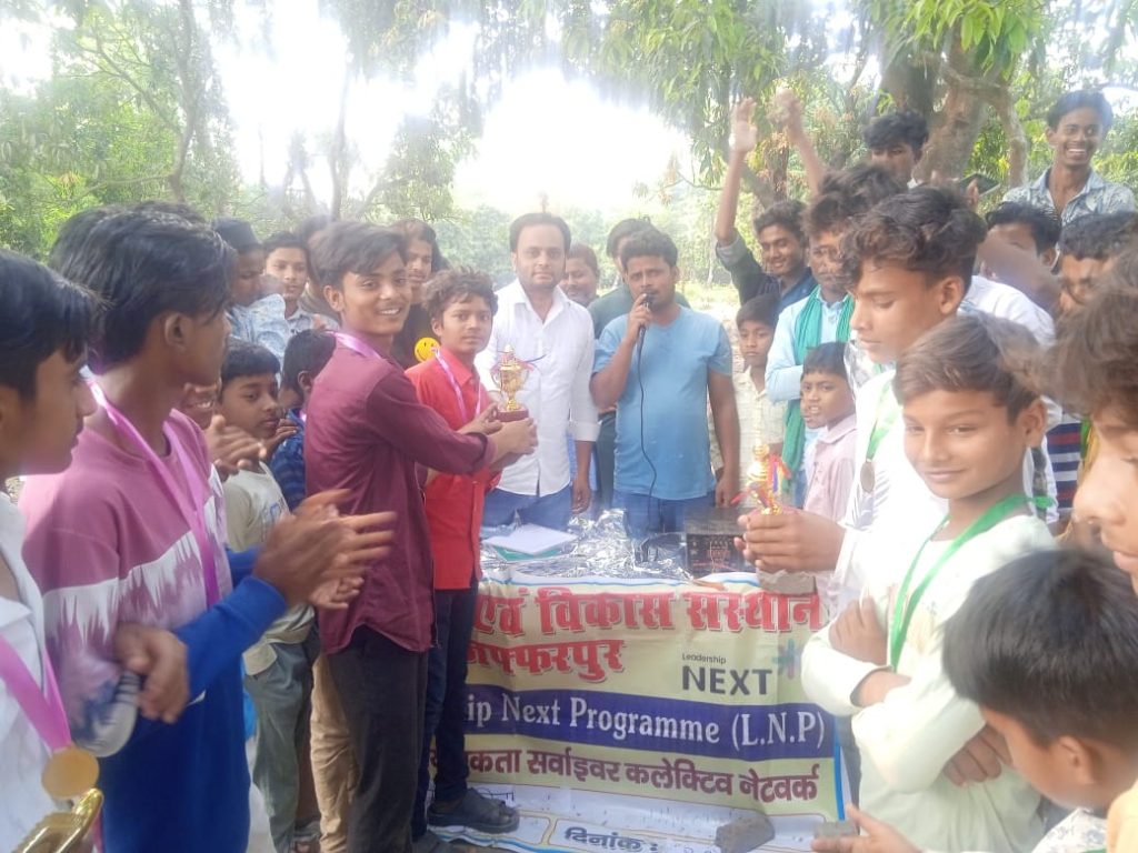 मुजफ्फरपुर जिला में समग्र शिक्षण एवं विकास संस्थान, बेतिया द्वारा संचालित परियोजना लीडरशिप नेक्स्ट प्रोग्राम के तहत जिला स्तरीय एकता सरवाईवर कलेक्टिव नेटवर्क और कलस्टर स्तरीय एकता सरवाइवर कलेक्टिव नेटवर्क के बच्चों के बीच क्रिकेट प्रतियोगिता का आयोजन मुसहरी प्रखंड के कन्हौली बिशनदत पंचायत के धीरंपट्टी गांव में किया गया, जिसमें सबसे पहले कलस्टर स्तरीय कलेक्टिव नेटवर्क के कप्तान मो सलमान की टीम ने टॉस जीतकर पहले बल्लेबाजी कर निर्धारित 10 ओवरों में 8 विकेट के नुकसान पर 54 रन बनाकर जिला स्तरीय कलेक्टिव नेटवर्क को 55 रनों का टारगेट दिया गया! बैटिंग टीम के तरफ से सबसे अधिक रन मो सोहैल ने 18 रन बनाए तथा फील्डिंग टीम के तरफ से अकबर ने 3 विकेट चटकाए! 55 रनों का लक्ष्य पाने हेतु उतरी जिला स्तरीय एकता सरवाइवर कलेक्टिव नेटवर्क के सर्वाइवर बच्चों की टीम ने रोमांचक मुकाबले में 10 वी ओवर में 7 विकेट खोकर 3 विकेट से जीत दर्ज की, सबसे अधिक रन विजेता टीम के तरफ से मो साहिल ने 29 रन बनाकर नाबाद रहे, जिन्हें मैंन ऑफ द मैच दिया गया! विजेता टीम के कप्तान मो अकबर को विजयी ट्रॉफी एलिजा पब्लिक स्कूल के डायरेक्टर मो अजीज आलम ने अपने हाथों से दिए, वार्ड सदस्य मजरूल हक ने रनर ट्रॉफी मो सलमान को देकर हौसला बढ़ाए, साथ ही साथ सभी खिलाड़ियों को मेडल समाजसेवी मो खुर्शीद, मो अताउल्लाह, शिवम कुमार और विनय दास ने पहनाई!