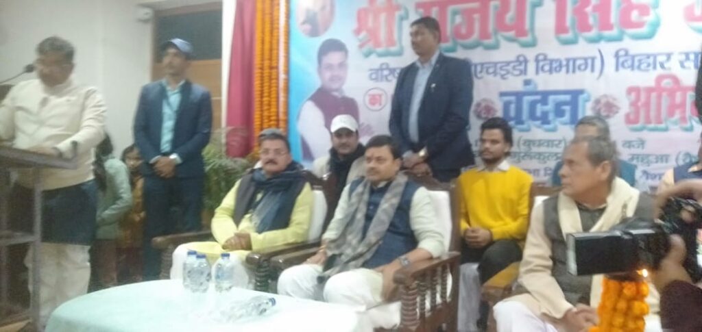 समारोह की अध्यक्षता परोपकारी सभा के चन्देश्वर राय तथा संचालन अजीत कुमार आर्य ने किया।अभय कुमार आर्य ने बुके एवं शॉल देकर स्वागत किया । समारोह को संबोधित करते हुए लोक स्वास्थ्य अभियंत्रण मंत्री संजय सिंह ने कहा कि महुआ विधानसभा क्षेत्र की जनता ने मुझे जो अपना प्यार और आशीर्वाद दिया है, उसे मैं एक सेवक के रूप में सेवा करके पूरा करूंगा।उन्होंने कहा कि महुआ की चर्चा अभी नहीं, आने वाले समय में इस प्रकार होगी जो की देश के अंदर महुआ नंबर वन की विधानसभा होगी।हम केवल पीएचईडी के मंत्री नहीं, बिहार सरकार के मंत्री हैं, जिनके द्वारा हम महुआ एवं चेहरा कला में जमीन उपलब्ध होने पर एक से एक ऐतिहासिक कार्य करेंगे, जिससे लोगों को अपने सेवक पर विश्वास पक्का हो पाएगा ।आप सबों का स्नेह और प्यार जिस प्रकार मिला है, आगे भी मिलता रहे ऐसी आशा और विश्वास है। समारोह में चंदेश्वर सिंह, भाजपा उत्तरी मंडल अध्यक्ष रमैया सिंह, मिथुन चक्रवर्ती उर्फ मिथुन सिंह, आर के डेयरी के रणधीर सिंह, इंद्रजीत कुमार, , डॉ पप्पू सिंह, हर्षवर्धन उर्फ फुद्दू जी ,प्रमोद सिंह, दीपक कुमार,संजय कुमार,तेज नारायण, राम कुमार, मुन्ना झा , दीपक कश्यप, कुंदन ठाकुर सहित अन्य गण्यमान लोगों ने अंग वस्त्र एवं पुष्प गुच्छ देकर स्वागत किया गया।