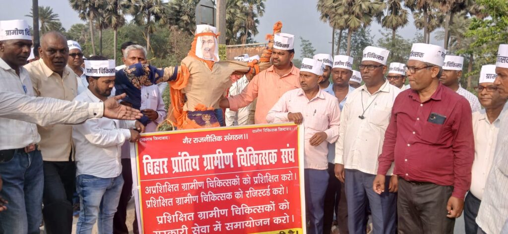 प्रखंड के महम्मदपुर सकड़ा मुरियास्थान में बिहार प्रांतीय ग्रामीण चिकित्सक संघ विभूतिपुर ने स्वास्थ्य मंत्री मंगल पांडे का पुतला दहन कर विरोध प्रदर्शन किया। कार्यक्रम में संघ के सदस्यों और समर्थकों ने बढ़-चढ़कर भाग लिया और ग्रामीण चिकित्सकों के प्रति अपमानजनक टिप्पणी के खिलाफ अपना विरोध जताया।पुतला दहन के दौरान नारेबाजी और प्रदर्शन हुआ, जिसमें ग्रामीण चिकित्सकों के सम्मान और अधिकारों की मांग की गई। इस अवसर पर संघ के नेताओं ने कहा कि यह विरोध प्रदर्शन ग्रामीण चिकित्सकों के आत्मसम्मान की लड़ाई है और तब तक जारी रहेगा जब तक मंगल पांडे सार्वजनिक रूप से माफी नहीं मांगते।मौके पर ग्रामीण शिक्षक संघ के प्रखंड अध्यक्ष डाॅ. श्रीनारायण यादव, सचिव डॉ. विशुनदेव प्रसाद सिंह,डॉ. राज कुमार राकेश, महादेव प्रसाद, मीडिया प्रभारी बबलू कुमार, चंदन कुमार, राजेश कुमार शर्मा, चंदन कुमार, सिकंदर कुमार, मिथलेश कुमार, अवधेश राय, अर्जुन दास, घुरन महतो, प्रवीण प्रभाकर,मो अल्लाउद्दीन,अग्निदेव प्रसाद सहित दर्जनों ग्रामीण चिकित्सक मौजूद थे।