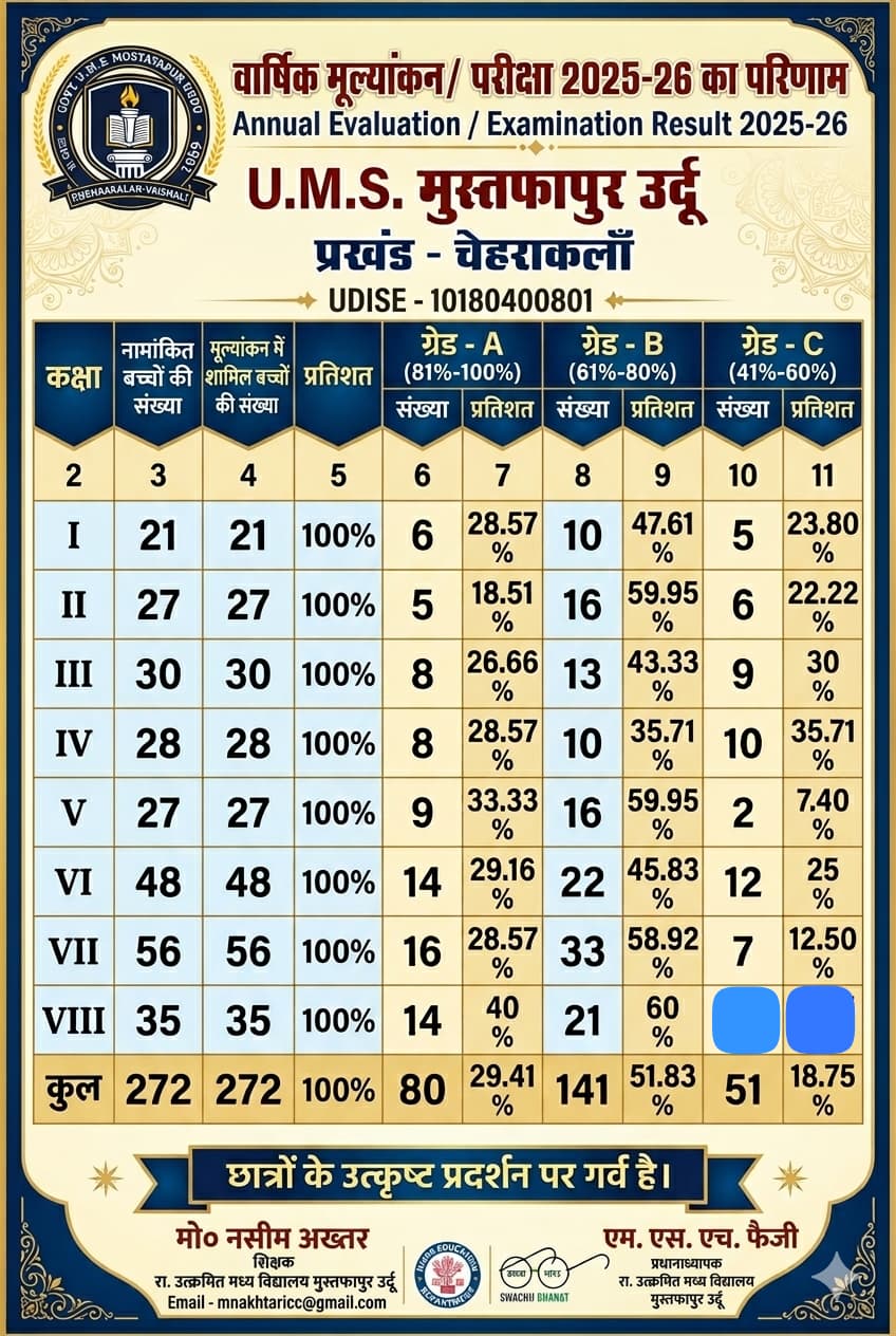वार्षिक परीक्षा परिणाम 2025-26 घोषित, U.M.S. मुस्तफापुर उर्दू का शानदार प्रदर्शन
