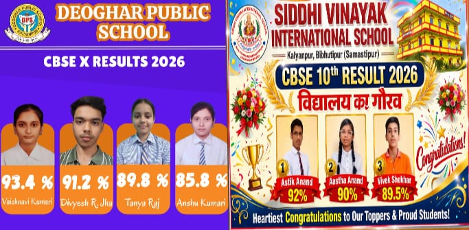सीबीएसई दशवीं बोर्ड परीक्षा के रिजल्ट में देवघर पब्लिक स्कूल बिशनपुर एवं सिद्धि विनायक इंटरनेशनल स्कूल कल्याणपुर के छात्र-छात्राओं ने परचम लहराया है। देवघर पब्लिक स्कूल की छात्रा वैष्णवी कुमारी 93.4 प्रतिशत, दिवेश रंजन झा 91.2 प्रतिशत, तान्या राज 89.8 प्रतिशत तथा अंशु कुमारी 85.8 प्रतिशत अंक प्राप्त कर विद्यालय की मान सम्मान को बढ़ाया है। वहीं इन छात्र-छात्राओं की सफलता पर विद्यालय की प्रधानाध्यापिका कामिनी झा ने सभी छात्र छात्राओं की उज्जवल भविष्य की कामना करते हुए बधाई दी है। वहीं सिध्दी विनायक इंटरनेशनल स्कूल कल्याणपुर की छात्र-छात्रा आस्तिक आनंद 92 प्रतिशत, आस्था आनंद 90 प्रतिशत एवं विवेक शेखर 89.5 प्रतिशत अंक प्राप्त कर विद्यालय की मान सम्मान को बढ़ाया है। विद्यालय के निदेशक रमेश कुमार ठाकुर ने बताया कि सीबीएसई 10वीं बोर्ड में तीन छात्राओं ने 90 प्रतिशत के आसपास एवं शेष सभी छात्र छात्राओं ने बेहतर अंक प्राप्त कर सफलता हासिल की है। उन्होंने सभी छात्र छात्राओं की उज्जवल भविष्य की कामना करते हुए बधाई दिया है।