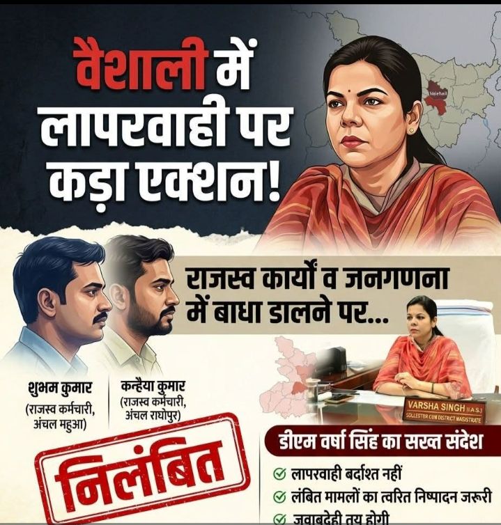 वैशाली की जिलाधिकारी वर्षा सिंह ने सरकारी कार्यों में शिथिलता और अनुशासनहीनता बरतने वाले कर्मियों पर सख्त कार्रवाई शुरू कर दी है। जनहित के कार्यों में बाधा डालने और कर्तव्यों के प्रति लापरवाही बरतने के आरोप में जिले के दो राजस्व कर्मचारियों को तत्काल प्रभाव से निलंबित कर दिया गया है।